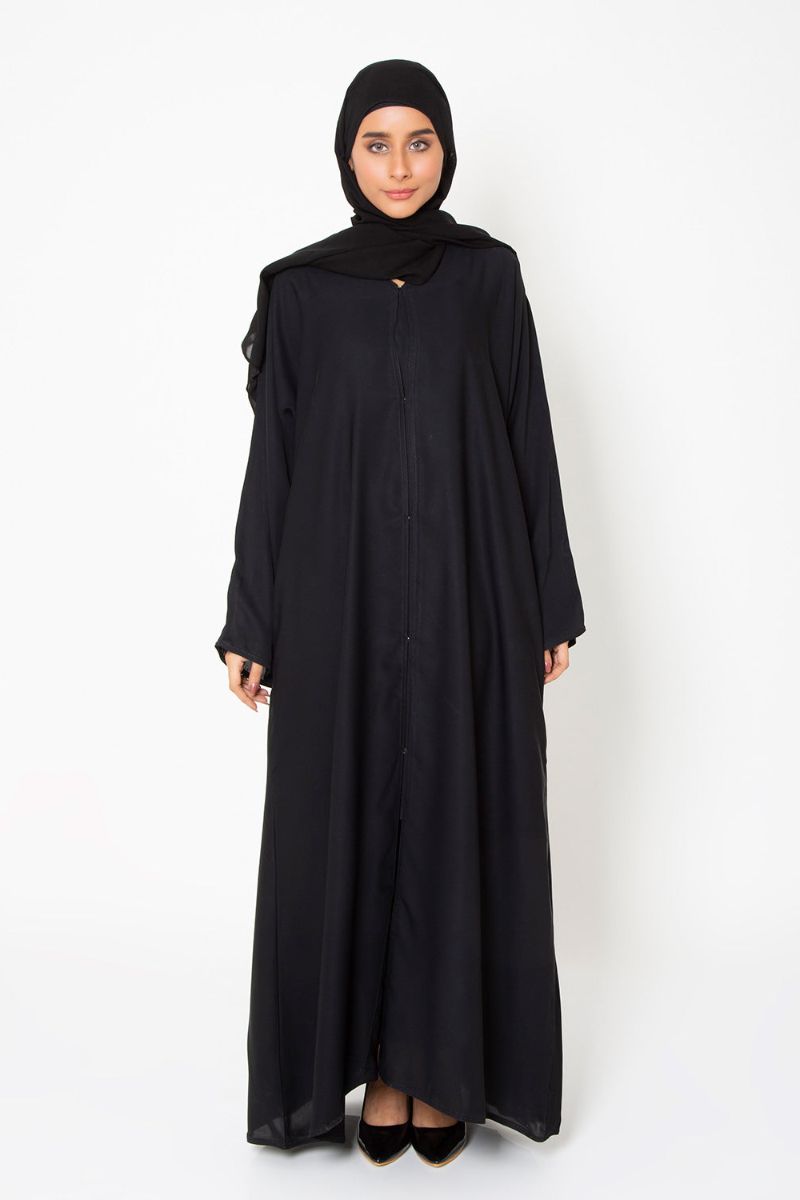 Product Features: Front-open Abaya, Straight simple sleeves, and Round neck.