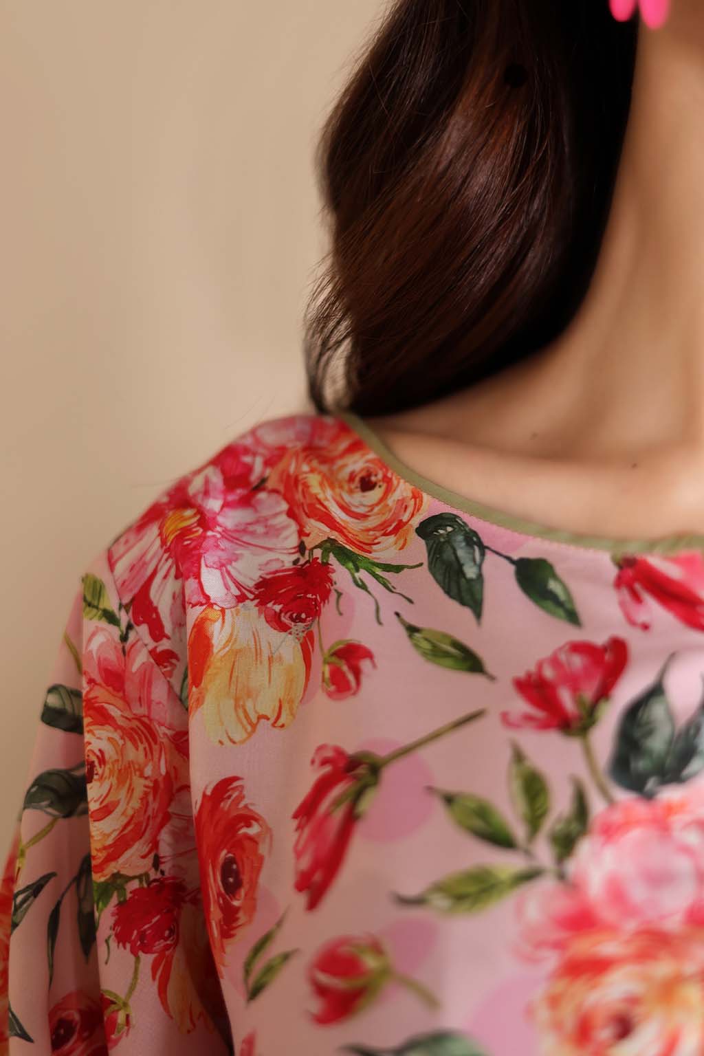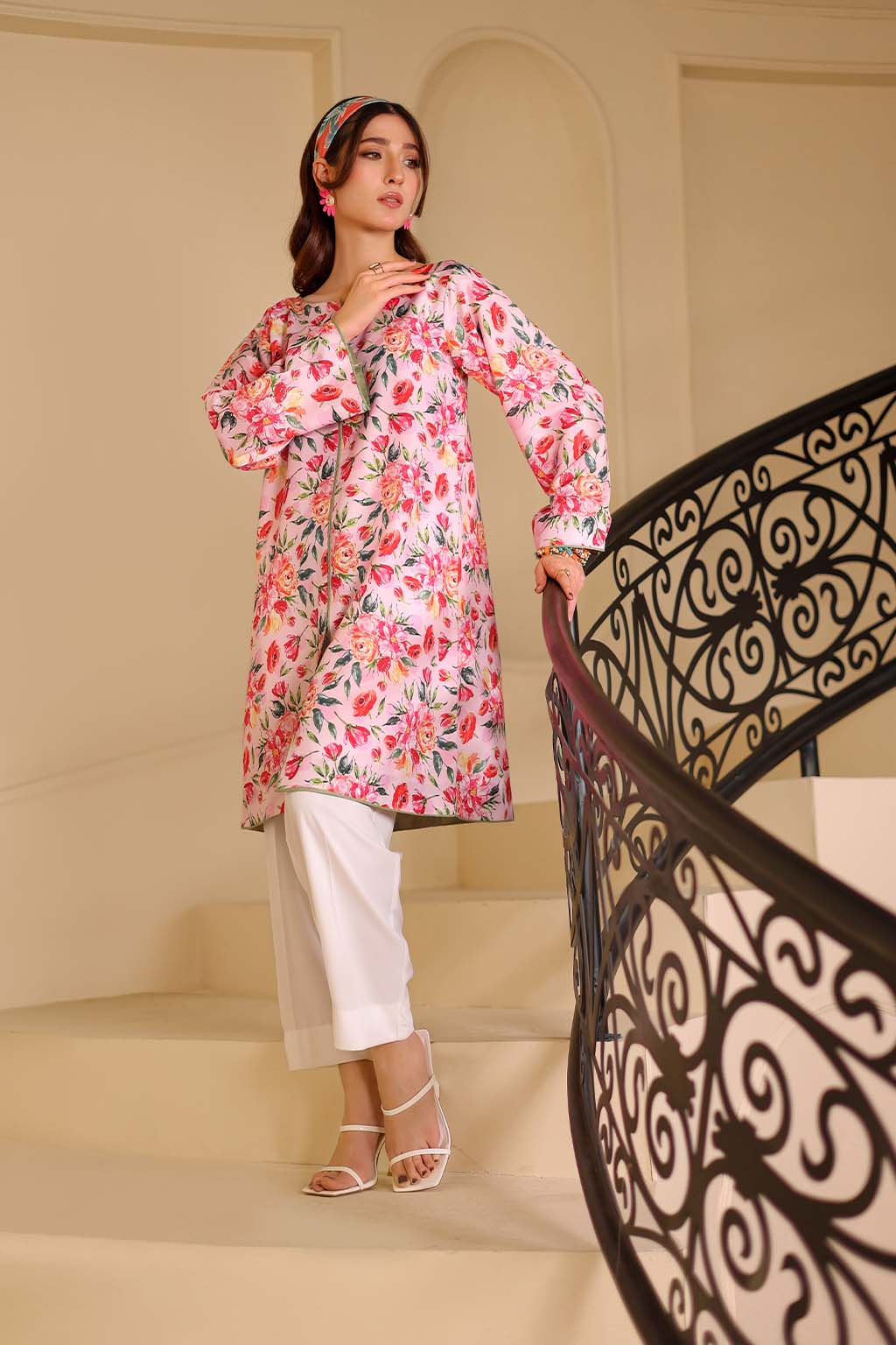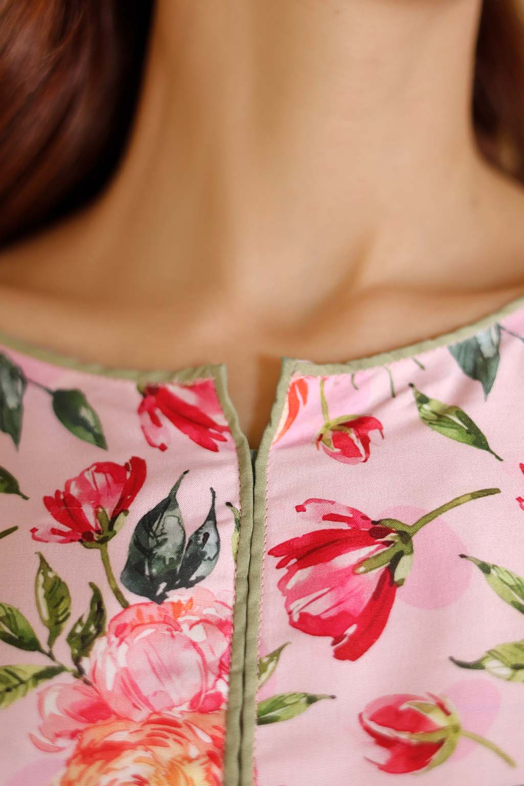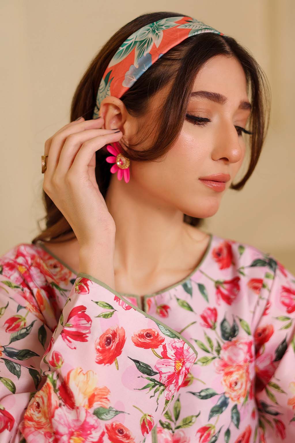 Add a cheerful pop of elegance to your wardrobe with the Rahma 2-Piece Coord Set from Adwears’ LUMINE Collection. Crafted from breathable Premium Lawn in a soft pink floral print, this set perfectly balances everyday comfort with graceful detailing. The top features a classic crew neckline, contrast green piping, and stylish slits at the front and sides for a flattering, breezy silhouette.