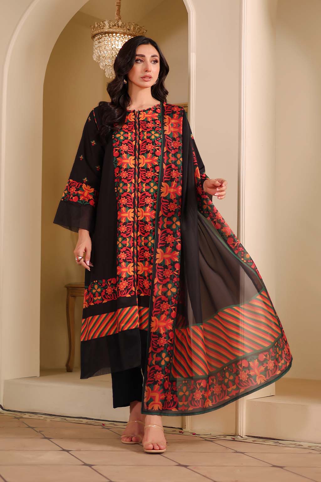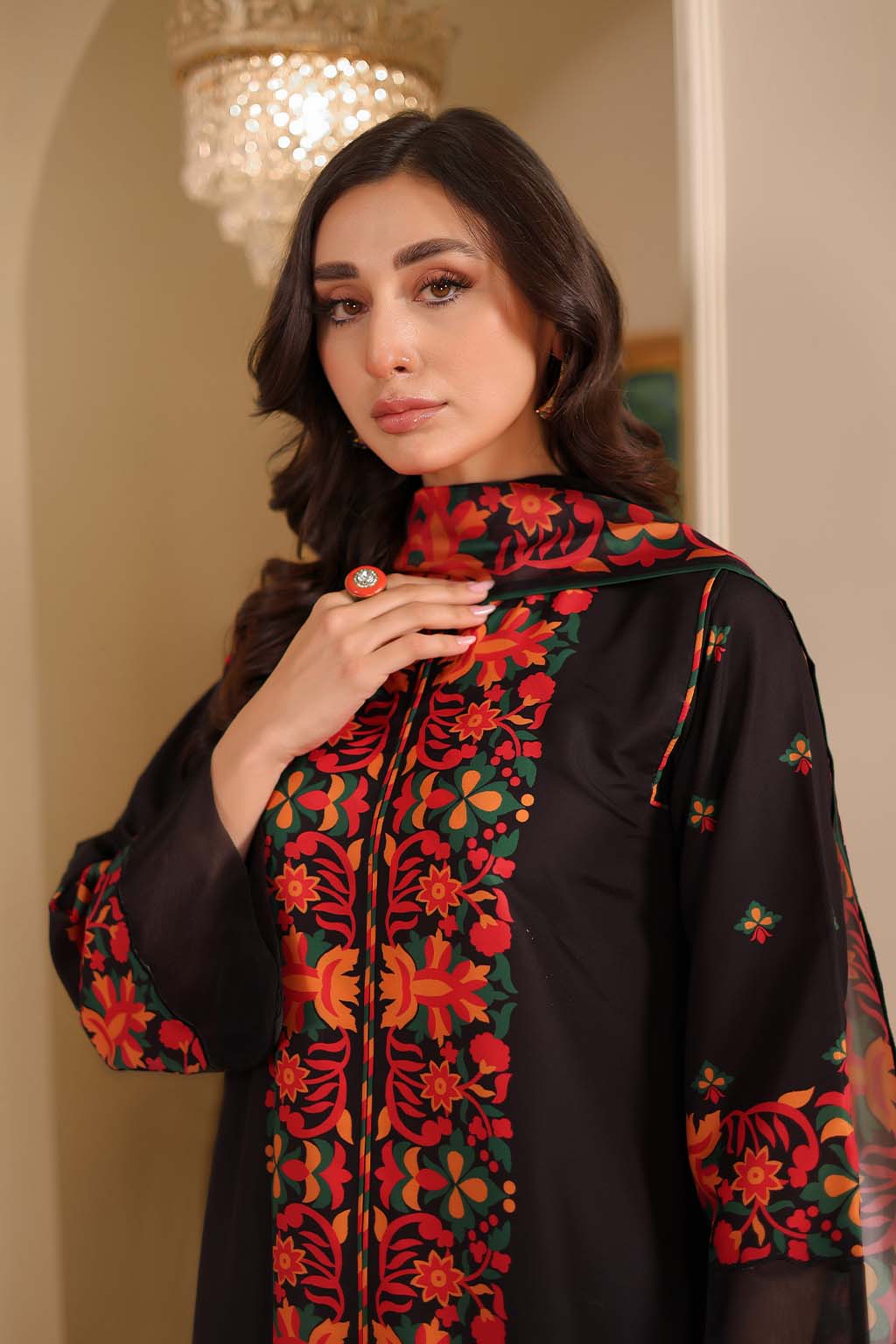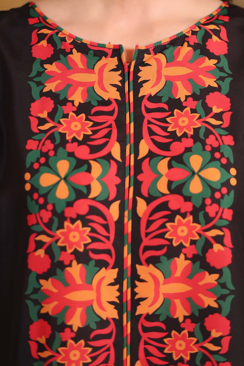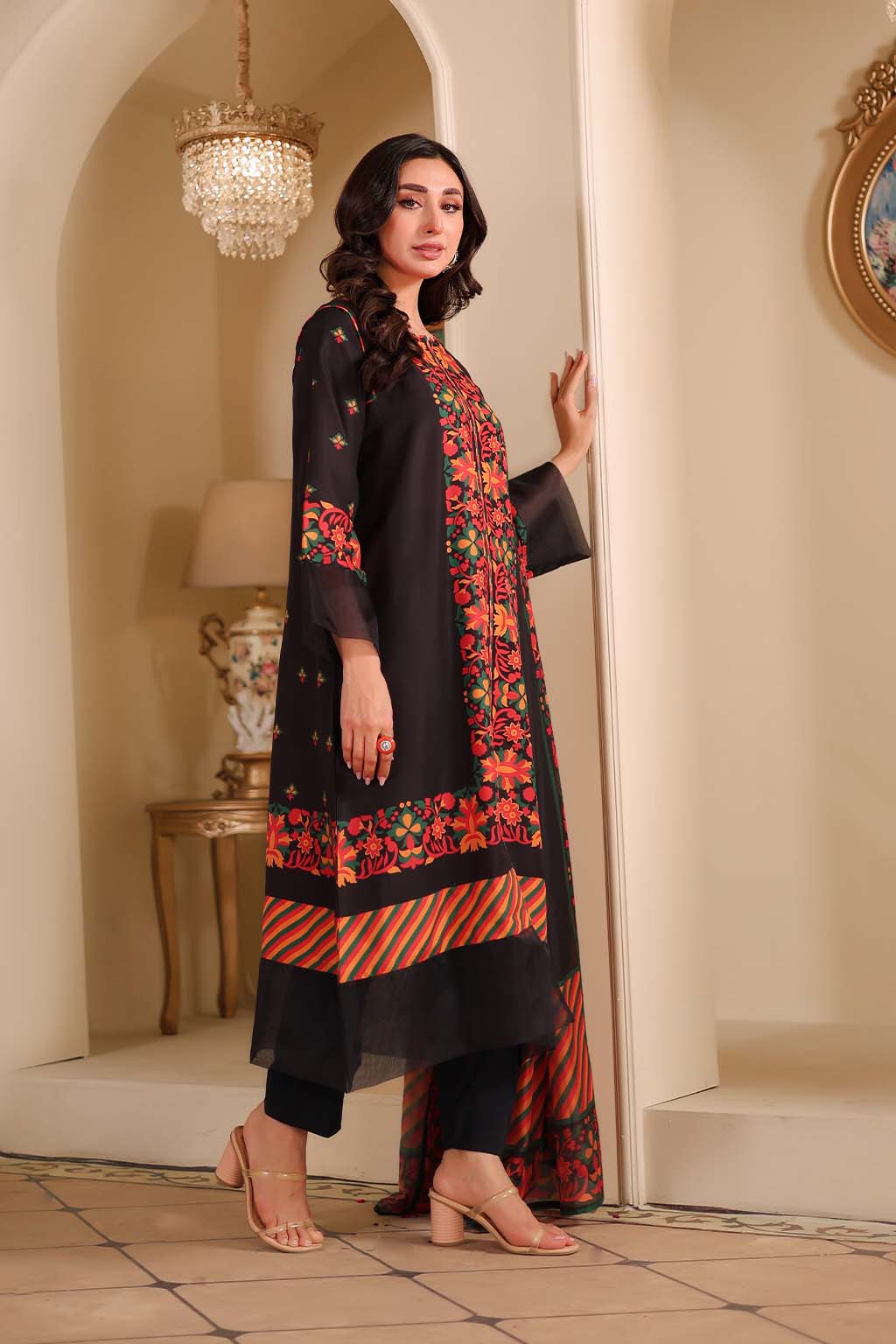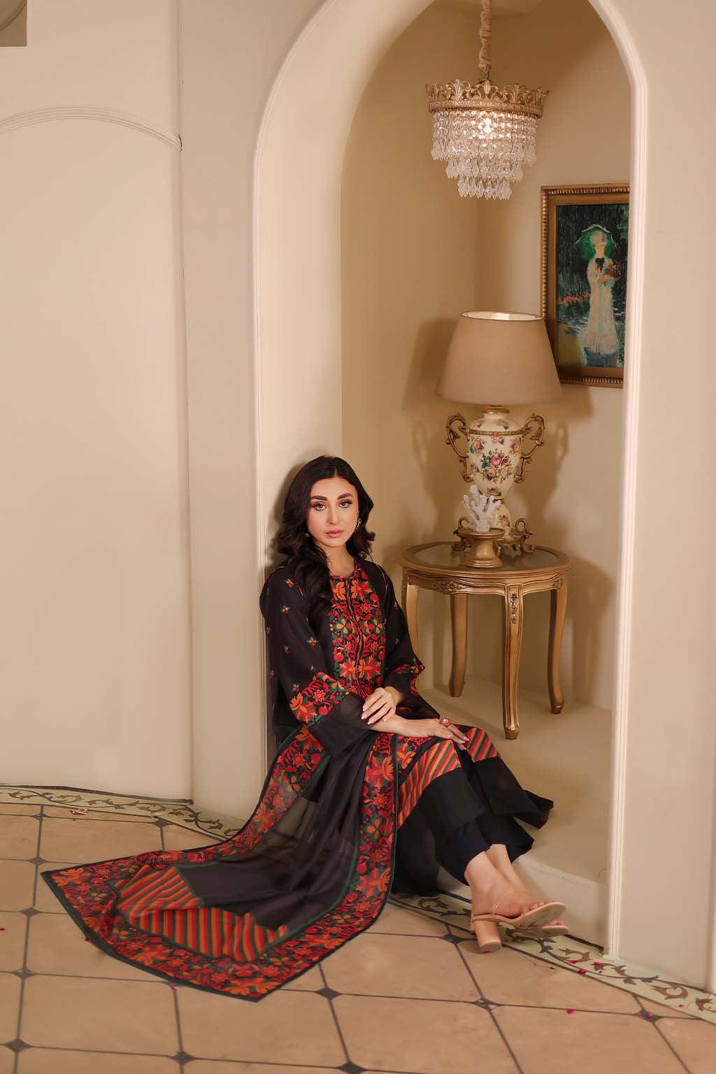 Striking and sophisticated, the Freesia Long Top 3-Piece Set from Adwears LUMINE Collection is designed to make a lasting impression. Crafted from soft black Premium Lawn, it features an elegant ethnic floral print accented with intricate geometric borders. The round neckline flows into a graceful hemline, while square armholes with hem insertsand full-length sleeves elevate the silhouette.