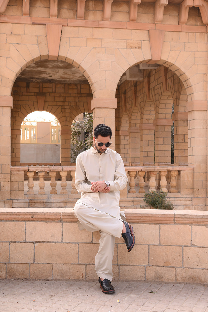 Beige Kamzeer Shalwar with stylish ban collar paired with Shalwar of same color. Adding Grace to your style on occasions and everyday look.