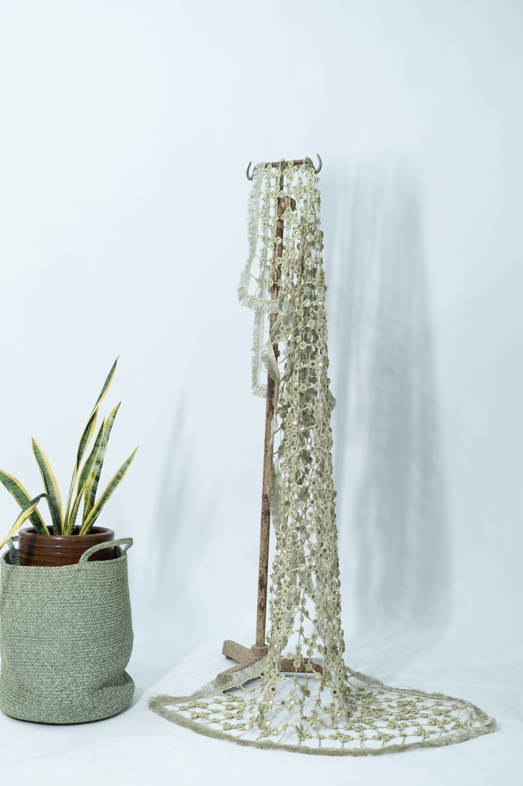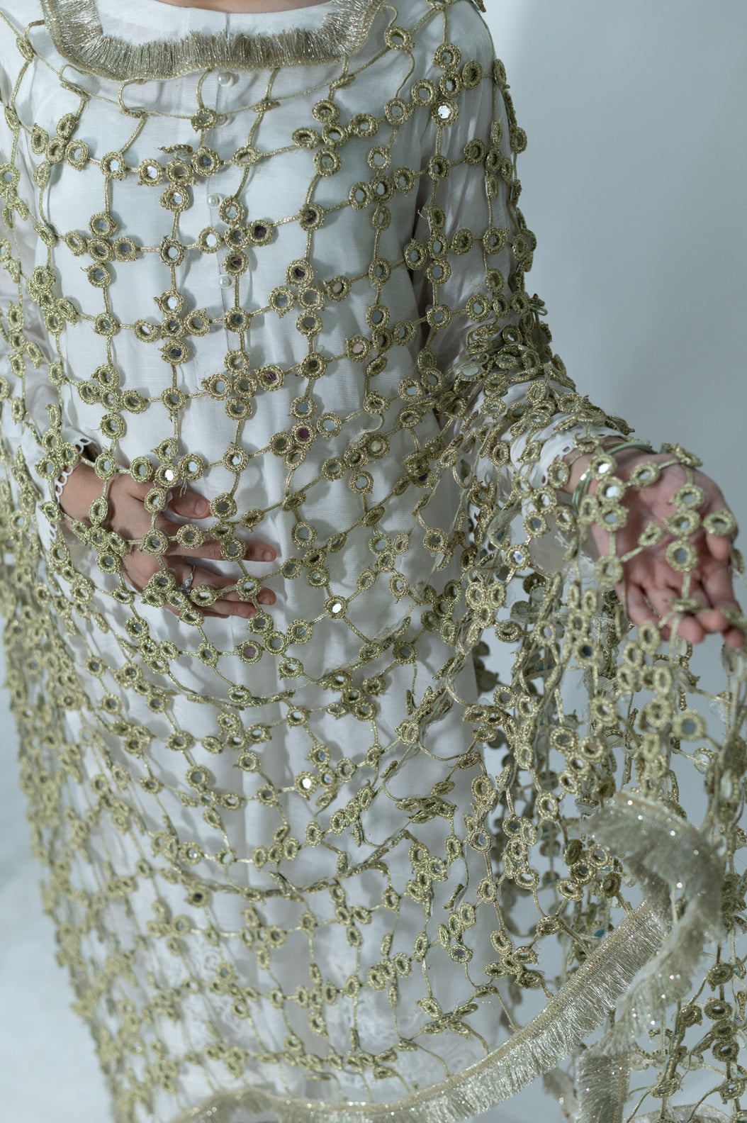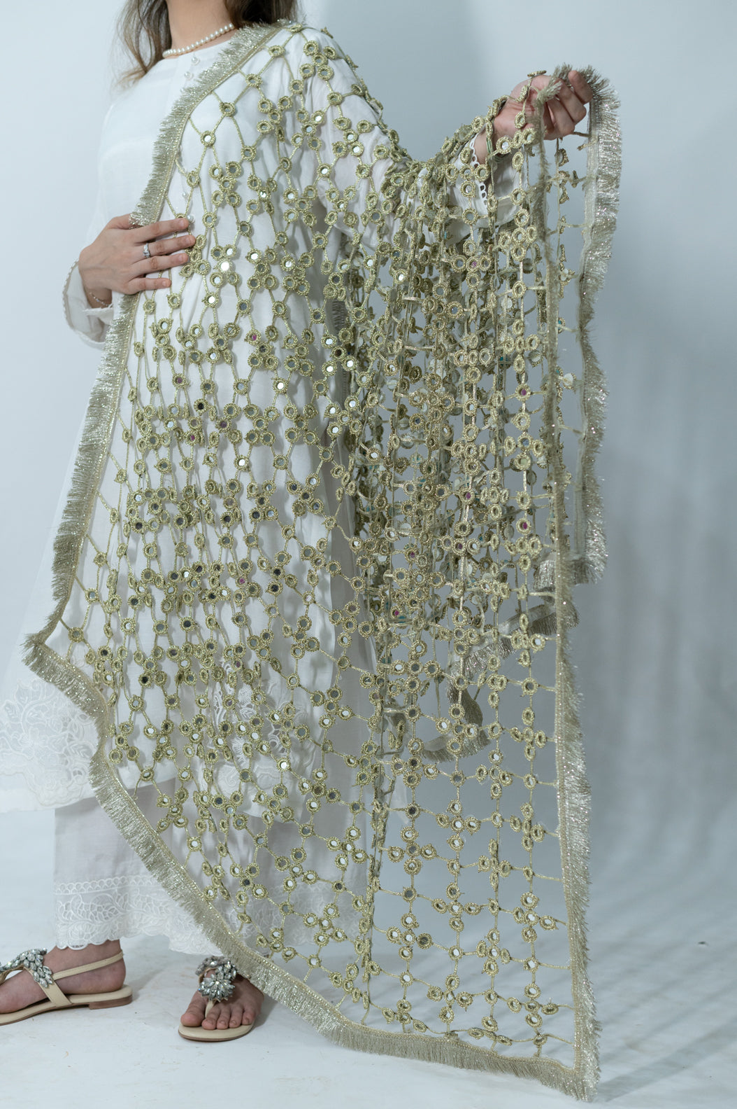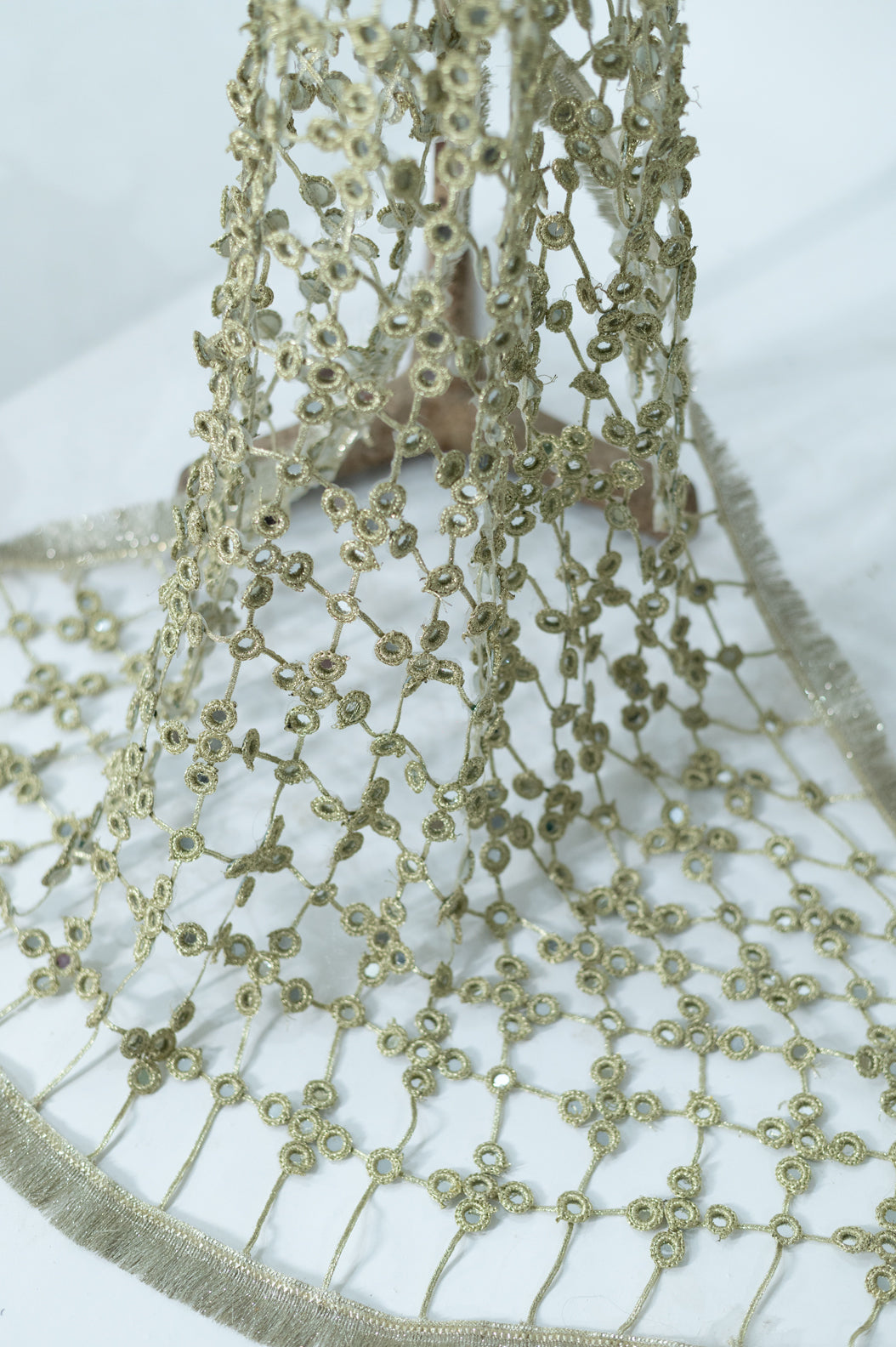 Handcrafted Golden sheesh dopatta. Disclaimer * The fabric pattern/laces, patchwork/emblishment, and handmade details may vary * * Product color may vary due to lighting, screen pixel and color settings.