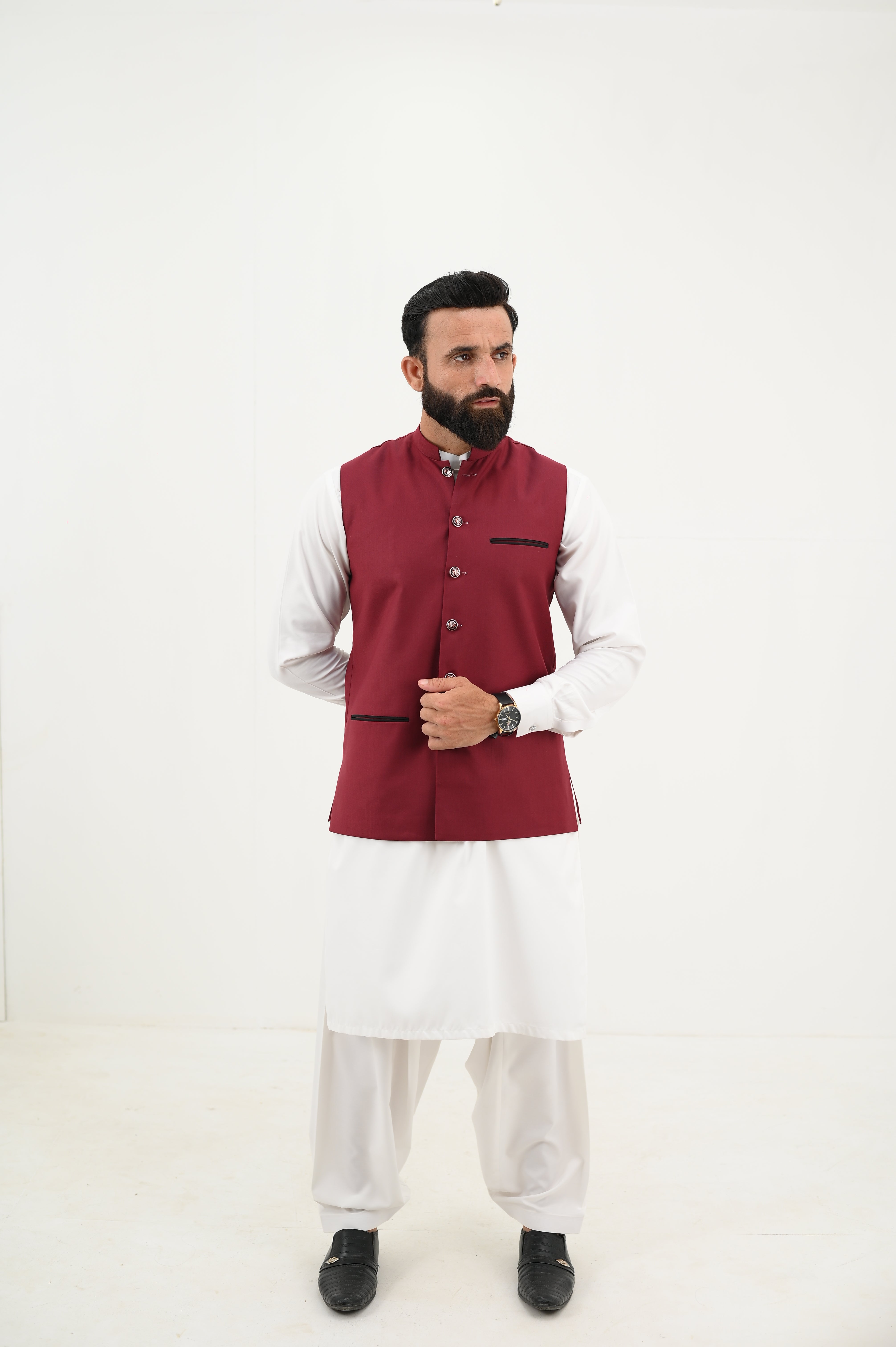 This ensemble radiates bold elegance and classic masculinity. The rich deep maroon waistcoat, contrasted with black trim details on the pockets, makes a commanding statement over the white kurta shalwar.