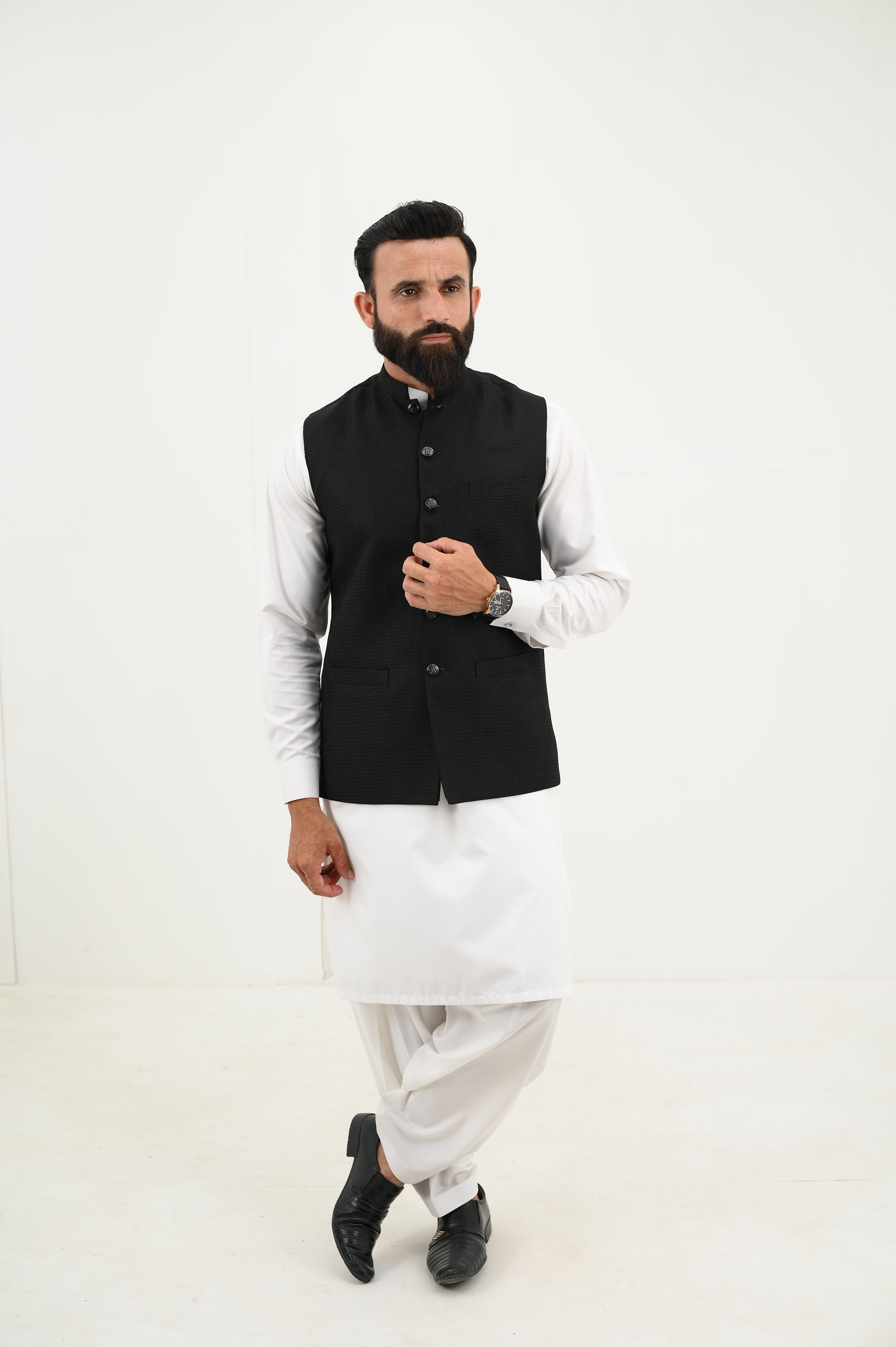 AlifYay White Kurta Shalwar & Woolen Black Waistcoat - AY-047 - Woolen - 3 Piece