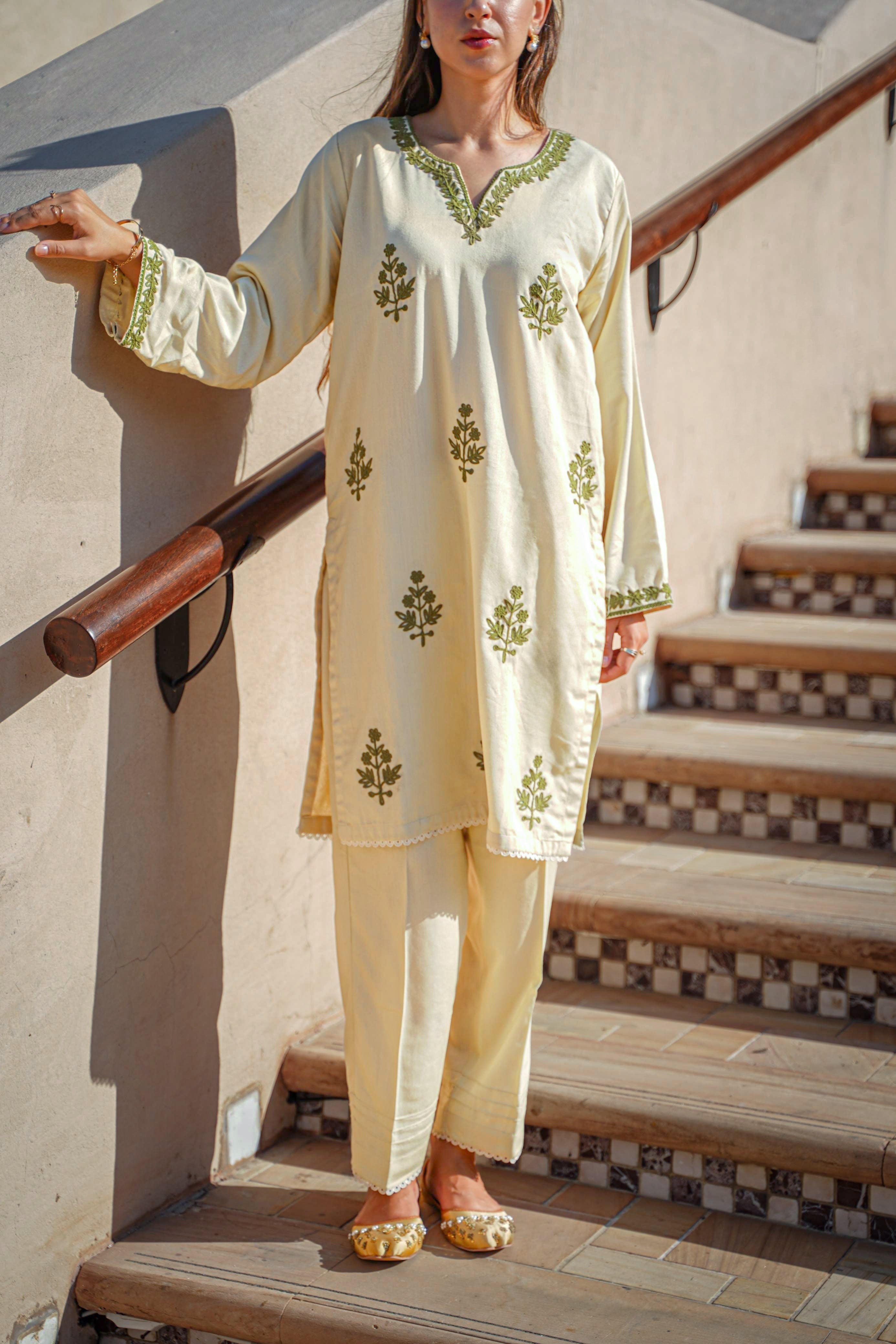 This elegant beige piece features intricate green dorri embroidery that flows beautifully across the fabric, enhanced by a delicate lace finishing. A perfect blend of sophistication and charm, adding a timeless touch to any wardrobe.