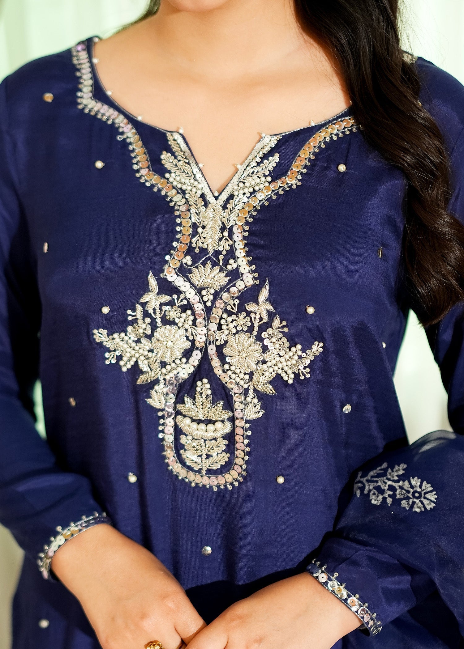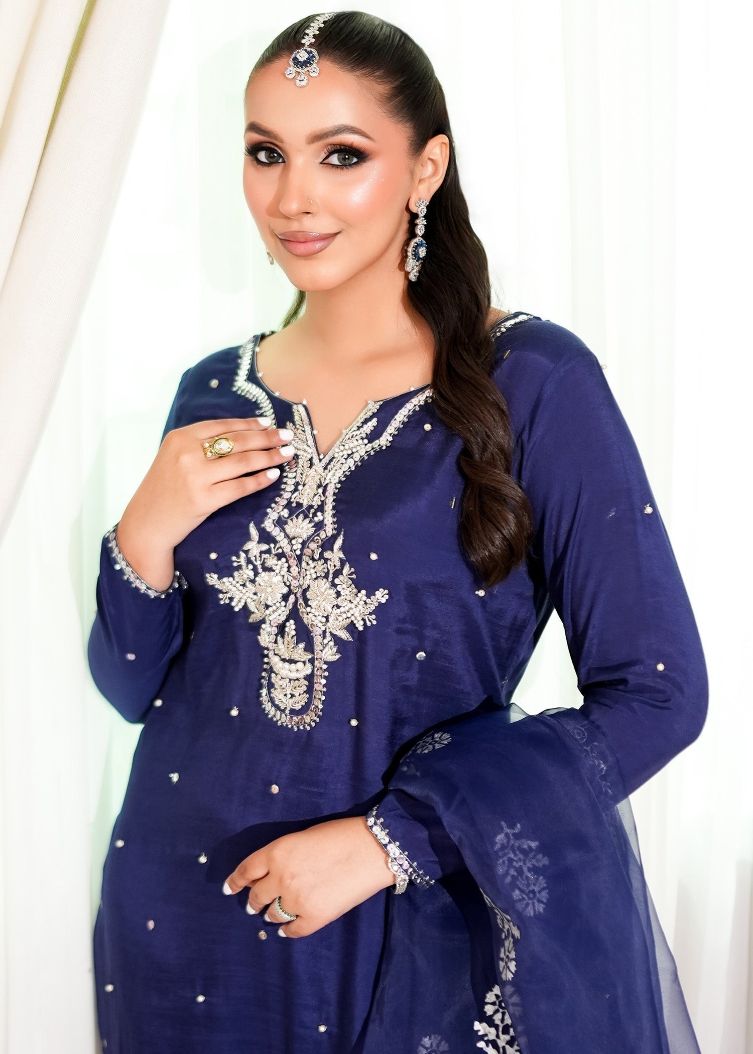 Step into refined elegance with this 3-piece luxury pret ensemble in a dreamy deep blue shade. The shirt, crafted from delicate hand work , features a beautifully designed front adorned with a blend of modern and traditional embellishments, showcasing a sophisticated fusion of styles. Paired with straight pants in premium silk, the silhouette is both graceful and contemporary. The look is completed with a soft, flowing organza dupatta, subtly enhanced with a block print borders and chatta.