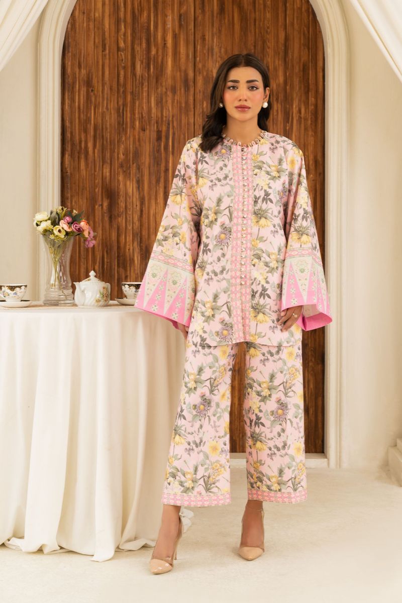 Turn heads and captivate with the rich elegance of this Floral blush pink set. Intricate pearl details and bell sleeves, this ensemble exudes elegance and sophistication