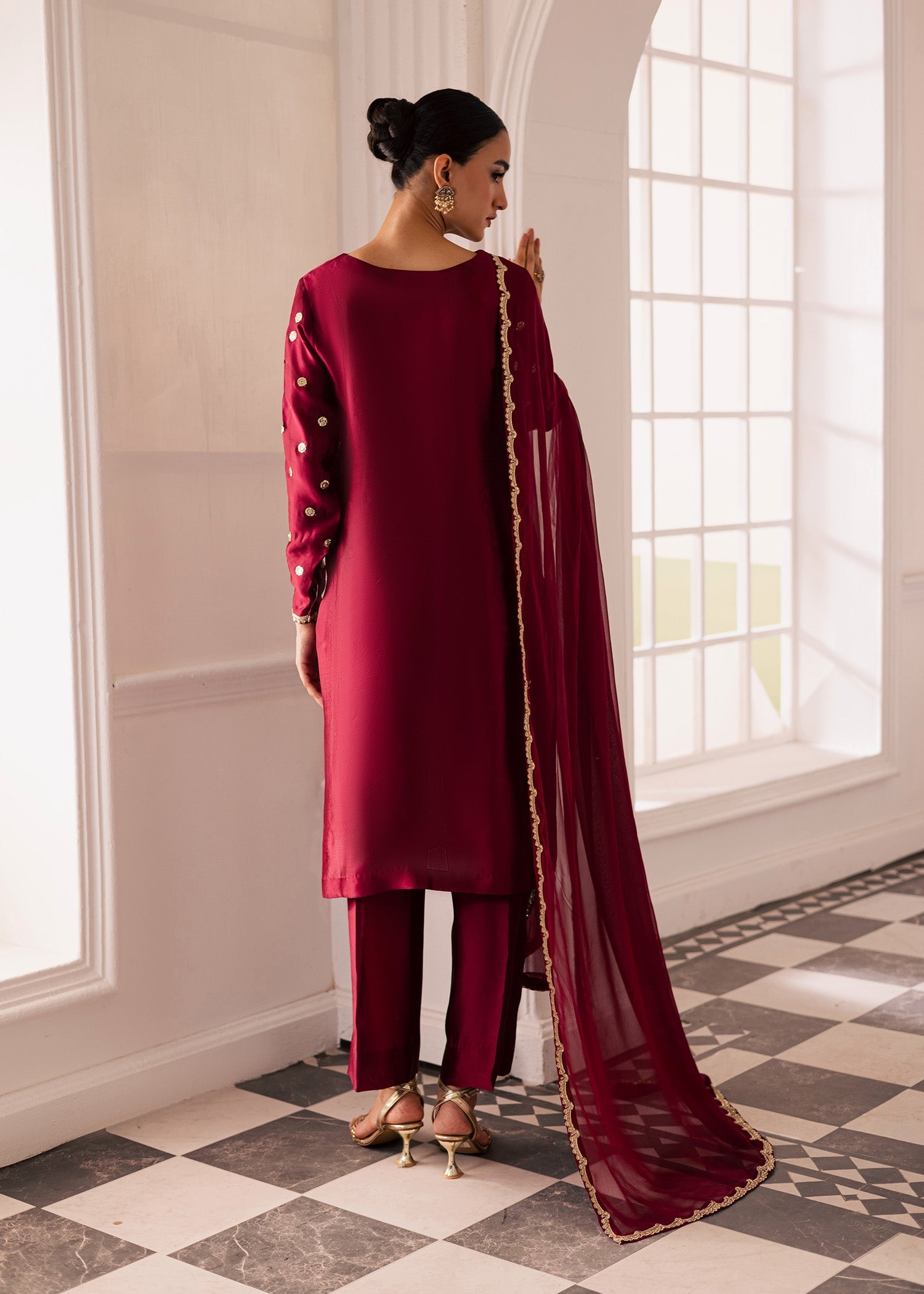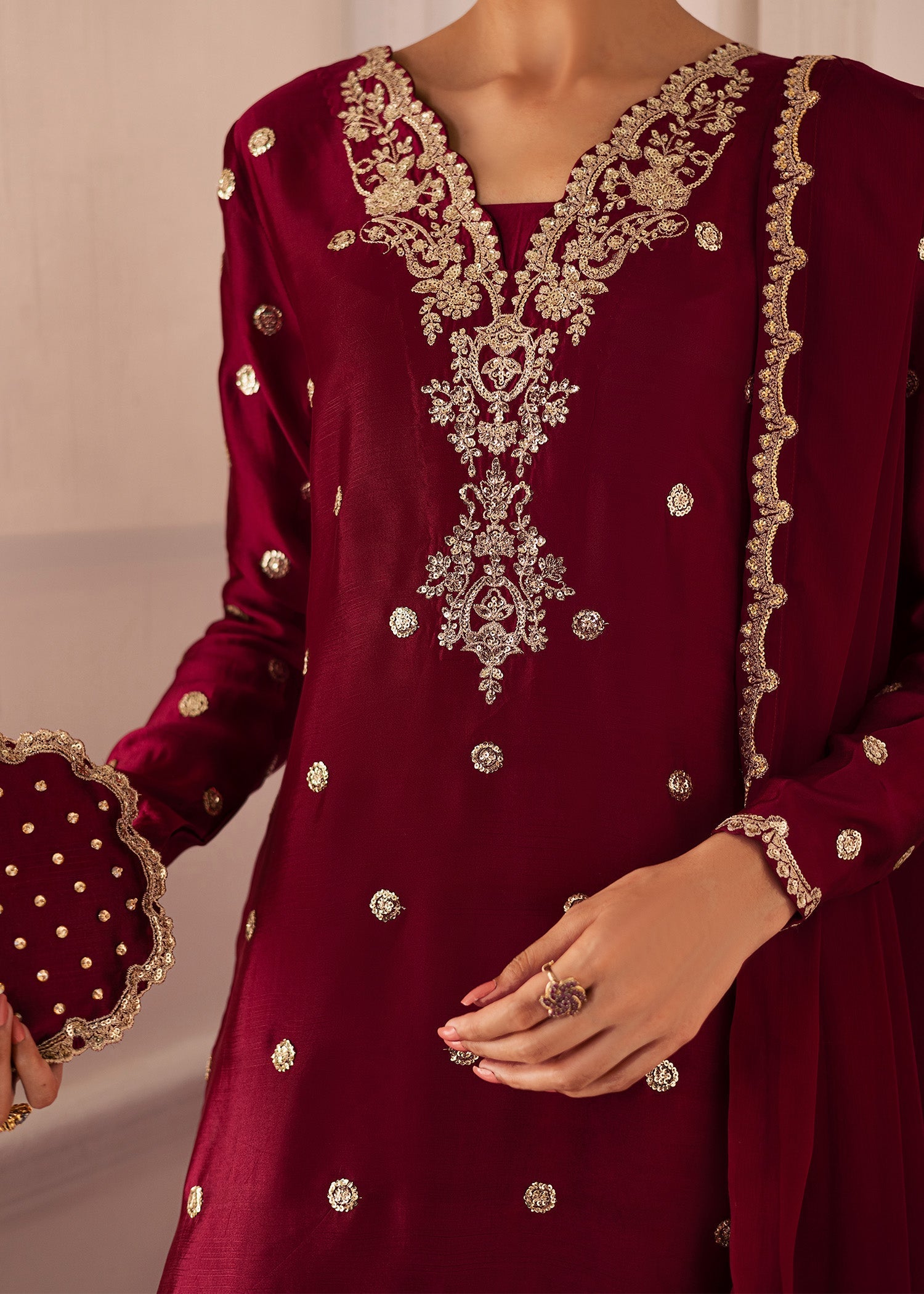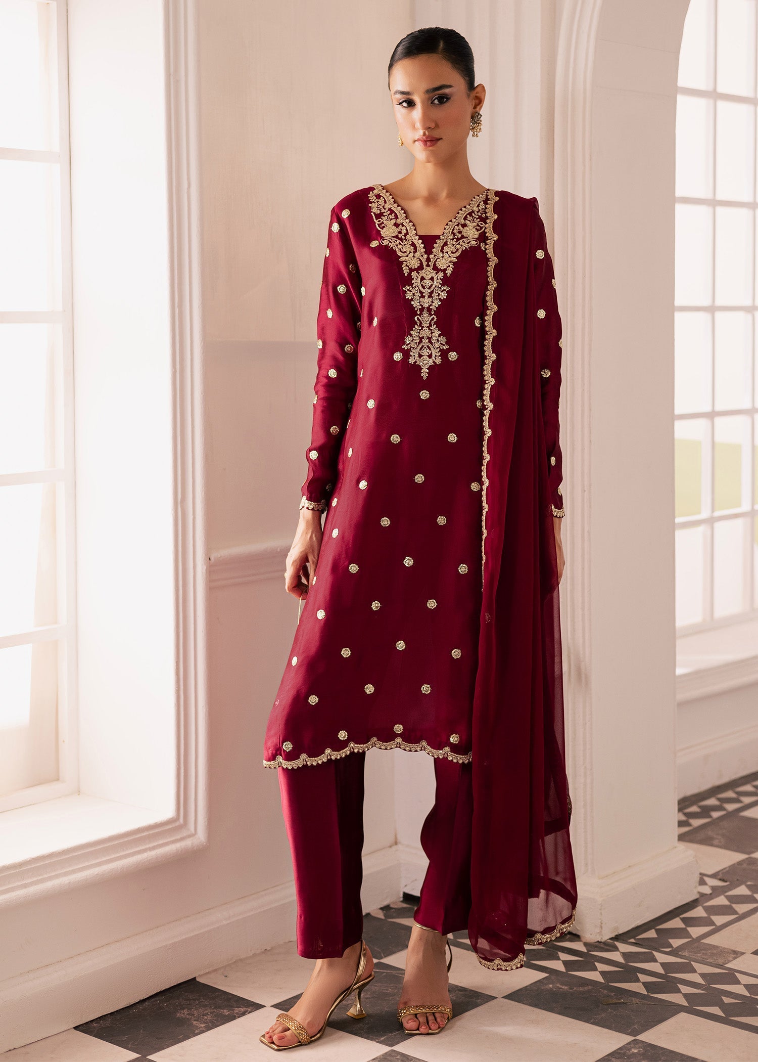 Step into timeless sophistication with this deep maroon embroidered ensemble, crafted to exude elegance and grace. The ensemble features a deep maroon or wine-colored fabric that radiates richness and sophistication. The long kurta, crafted with clean, graceful lines, showcases exquisite gold embroidery along the neckline and front panel — intricate floral and geometric motifs that add both texture and regal allure. The cut of the kurta is modern yet classic, falling beautifully over wide-legged trousers that lend a sense of effortless flow and comfort. The fabric’s smooth sheen enhances the outfit’s luxurious appeal, catching the light in soft, elegant tones. Paired with a matching dupatta adorned with delicate embroidered borders - ideal for festive gatherings, formal occasions, or any moment that calls for an air of effortless grandeur.