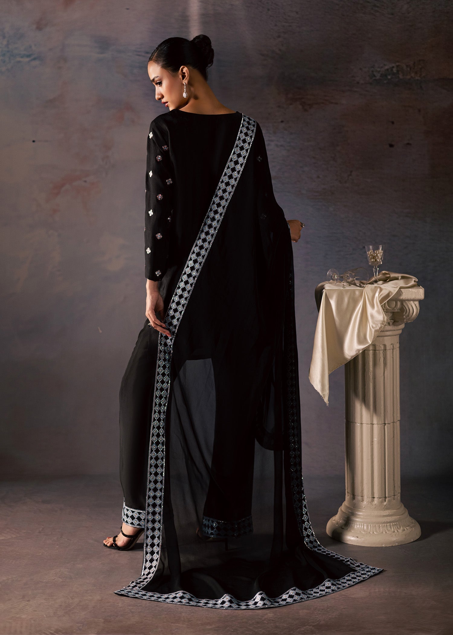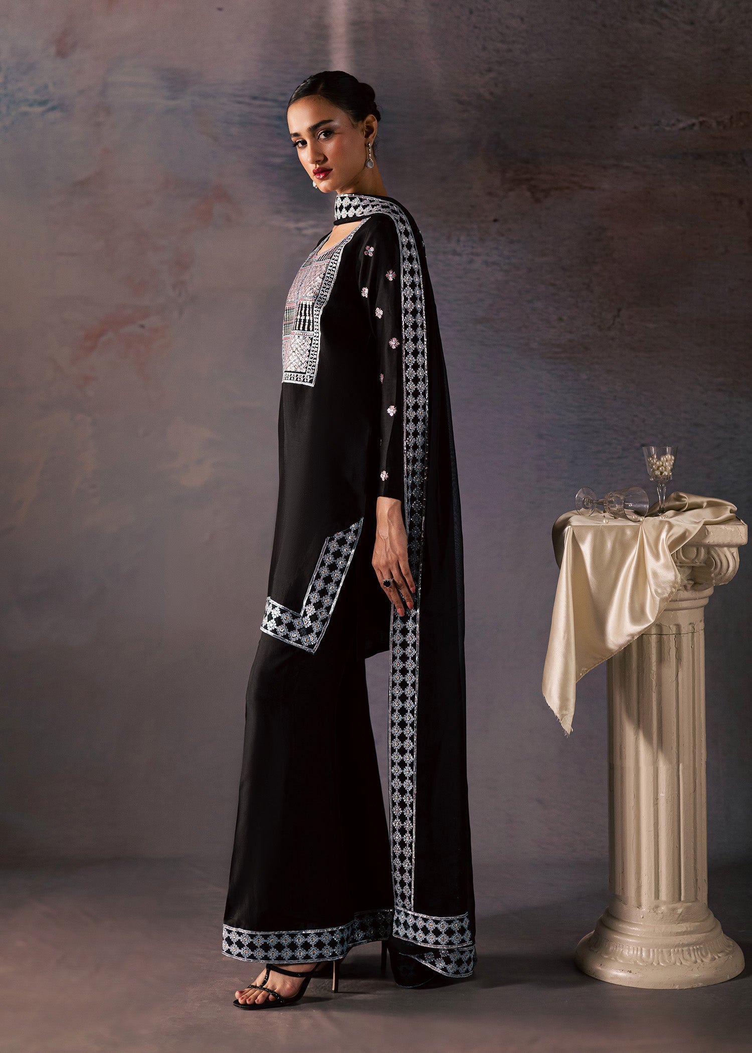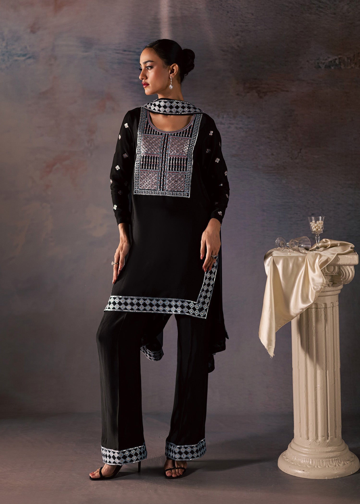 CANDY - This black outfit features a flowing, mid-length silhouette that flatters every body type, allowing for fluid motion and undeniable charm, while delicate stitching along the neckline adds a touch of redfined detail. Its rich, luminous sheen catches the light beautifully, creating a natural shimmer that turns heads at every occasion. Paired with flared pants with embroidered border and flowy chiffon dupatta. Each hue is carefully chosen to highlight the fabrics natural glow and elevate the entire look!