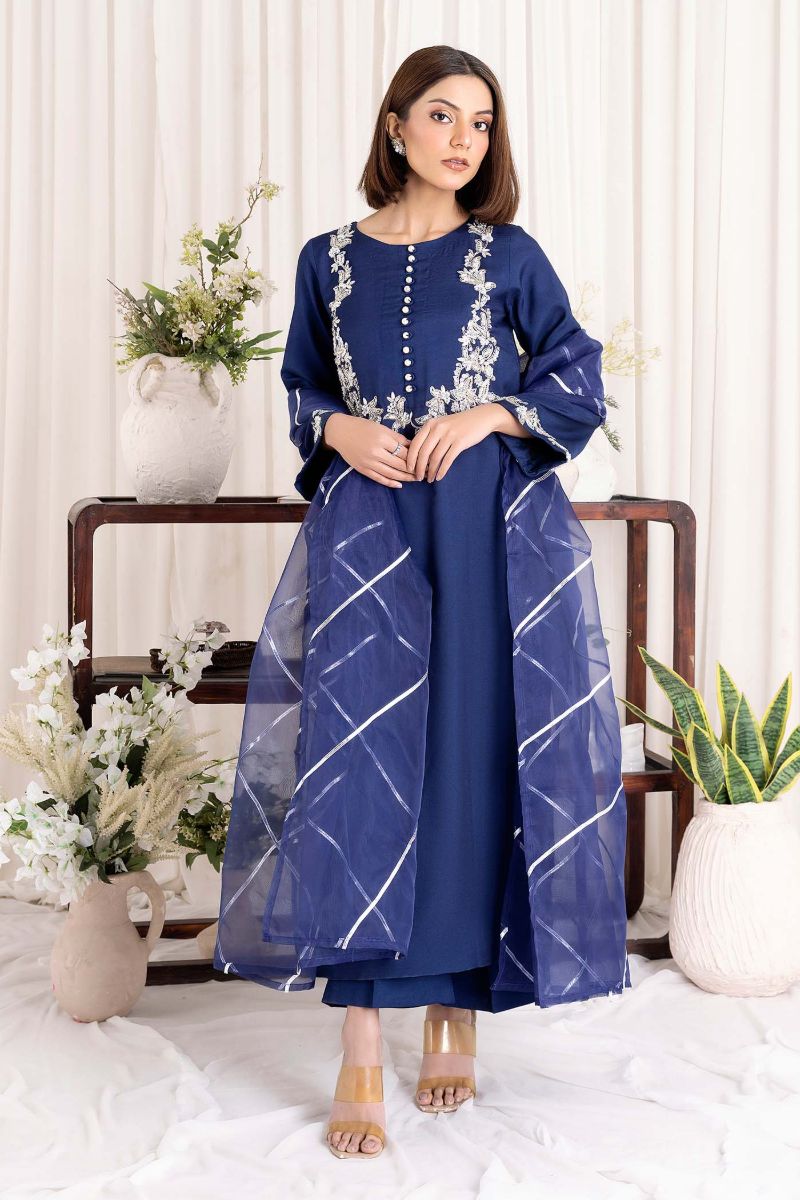 Dream, a modern elegance! This contemporary solid silk set is adorned in enchanting silver work. The glistening adornments and intricate embroidery intertwine to create enchanting floral motifs, elevating the overall look with an irresistible, glamorous allure.