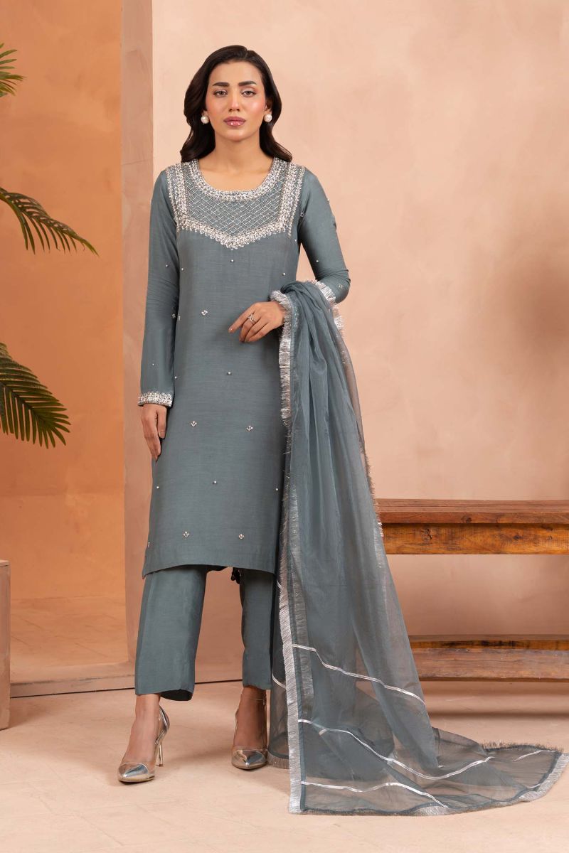 A masterpiece of elegance and artistry. This luxurious ensemble features a beautifully crafted neckline with intricate handwork making every detail stand out. The design is brought to life with a delicate spray of pearls and sequins in perfection. A perfect fusion of traditional craftsmanship and modern flair, this outfit is sure to turn heads at any occasion.