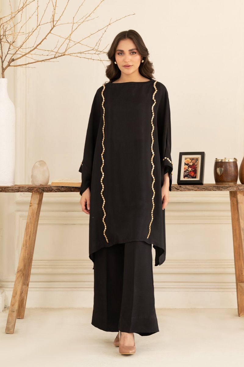 A Graceful black silk set featuring a flowy cutline detailed with crystal waves motif. Paired with flared pants to complete the look.