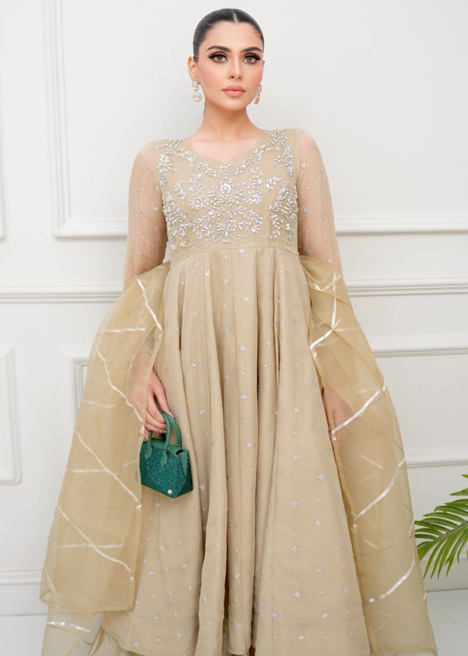 This sophisticated three-piece ensemble is presented in a warm champagne beige hue, offering a timeless and understated elegance perfect for elevated festive wear. Designed to exude grace and refinement, the outfit features a fluid, flared silhouette that enhances movement while maintaining a structured, flattering form. The bodice is adorned with intricate, finely detailed embroidery that adds a subtle shimmer against the neutral base, creating a luxurious yet balanced aesthetic. The embellishment is thoughtfully placed to highlight the upper silhouette, flowing seamlessly into the airy fall of the fabric. The look is completed with a sheer, lightweight dupatta, finished with delicate linear accents along the borders. Its fluid drape adds movement and dimension, perfectly complementing the understated elegance of the ensemble.