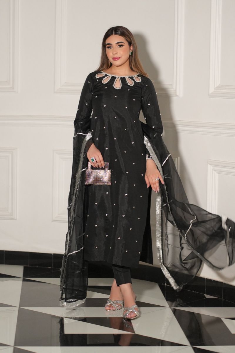 A gorgeous black long shirt adorned with silver and pearl embellishments around the neckline and along the front, paired with straight pants and a flowy dupatta featuring exquisite lace detailing.