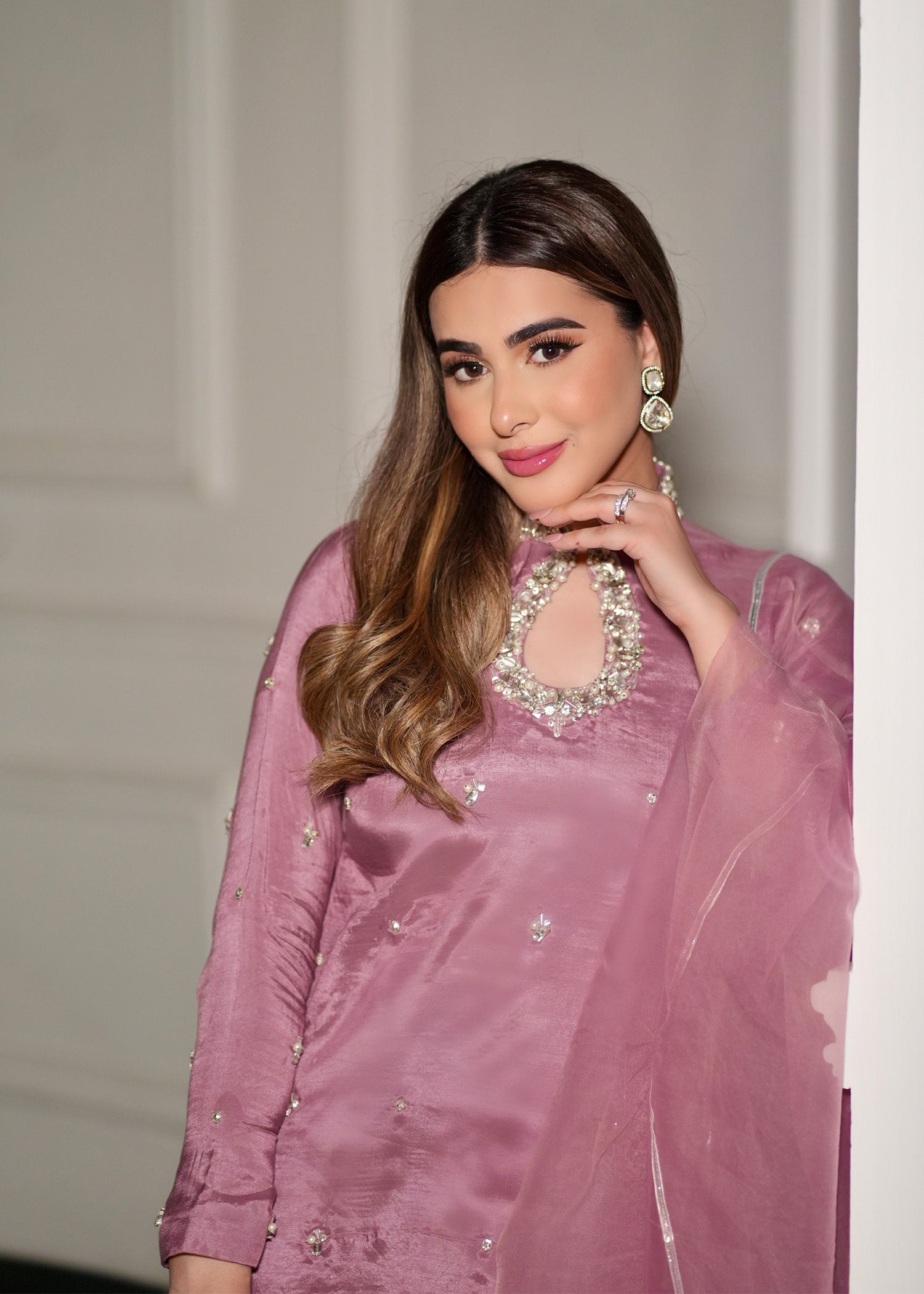 Elevate your style with this stunning Mauve shirt, featuring exquisite hand work on the neckline and sleeves for a touch of delicate sophistication. paired with straight pants and flowing organza dupatta with silver lace finishing — making sure you stand out with poise and beauty