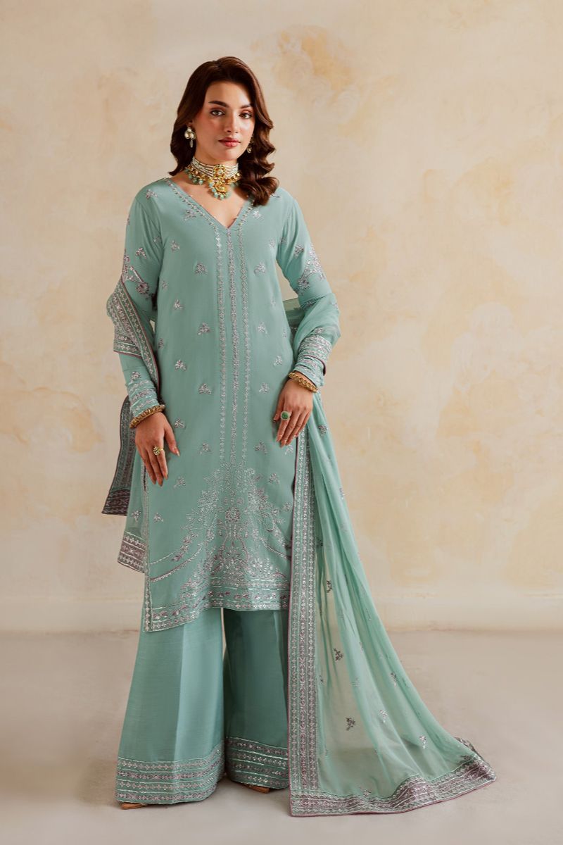 Seerat - This elegant piece is perfectly adding a touch of lightness and sophistication to your wardrobe. The shirt features soft hue thread, tilla and sequin work, this combination effortlessly blends contemporary style with traditional elements. It is paired wiyth a sharara pants anmd chiffon dupatta which consists of a heavily embellished border. Make a statement and embrace your unique flair with this captivating ensemble that exudes confidence and grace!
