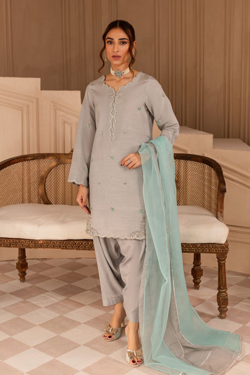 SELENA - rendered on an Cloud grey base embellished with aqua & silver tones. Accompanied with shinning organza dupatta with immaculate stitching details. Paired with a traditional shalwar to complete the look.