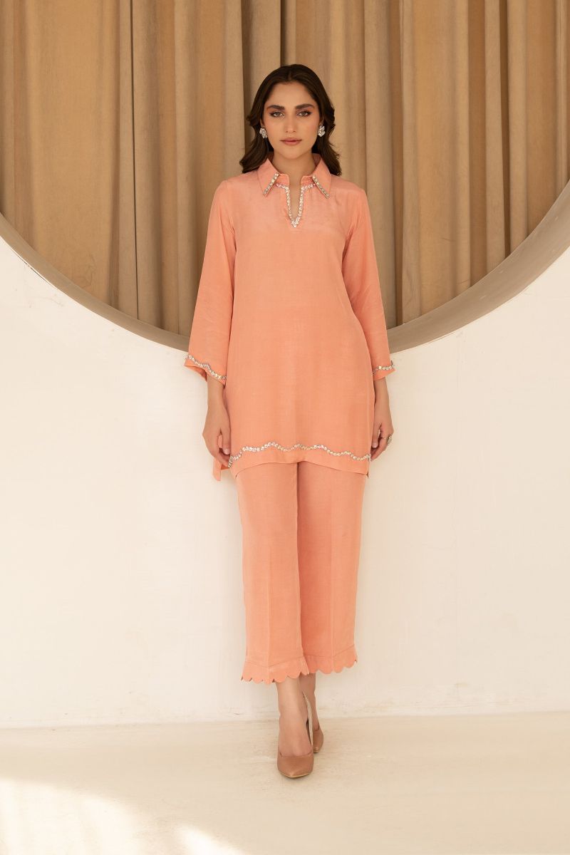 Urwa, the shirt boasts a sophisticated neckline with multicoloured Swarovski crystals sprayed all over, paired with straight pants to create a cohesive and polished look.