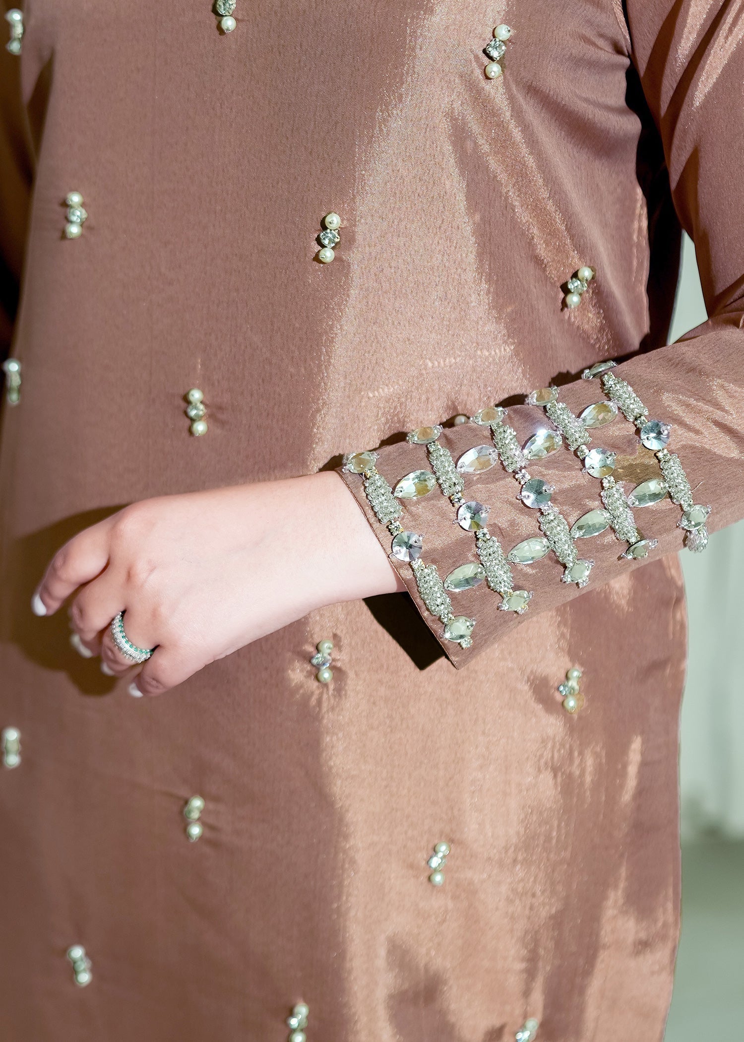 A charismatic brown raw silk shirt with beautifully hand worked front, exudes timeless sophistication, featuring a beautifully embellished sleeve that adds a touch of luxury and charm. It comes with tappered pants with pearl detials and organza dupatta beautifully decorated with silver gota.