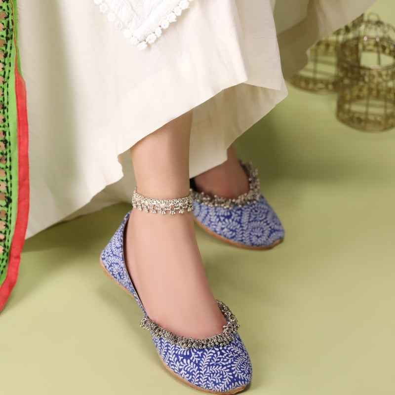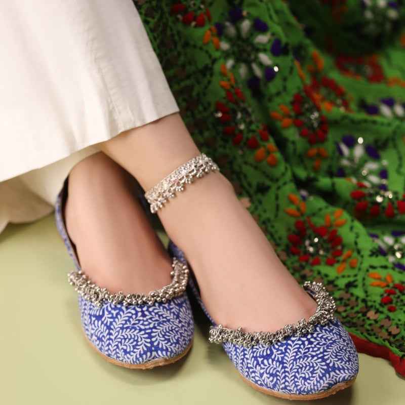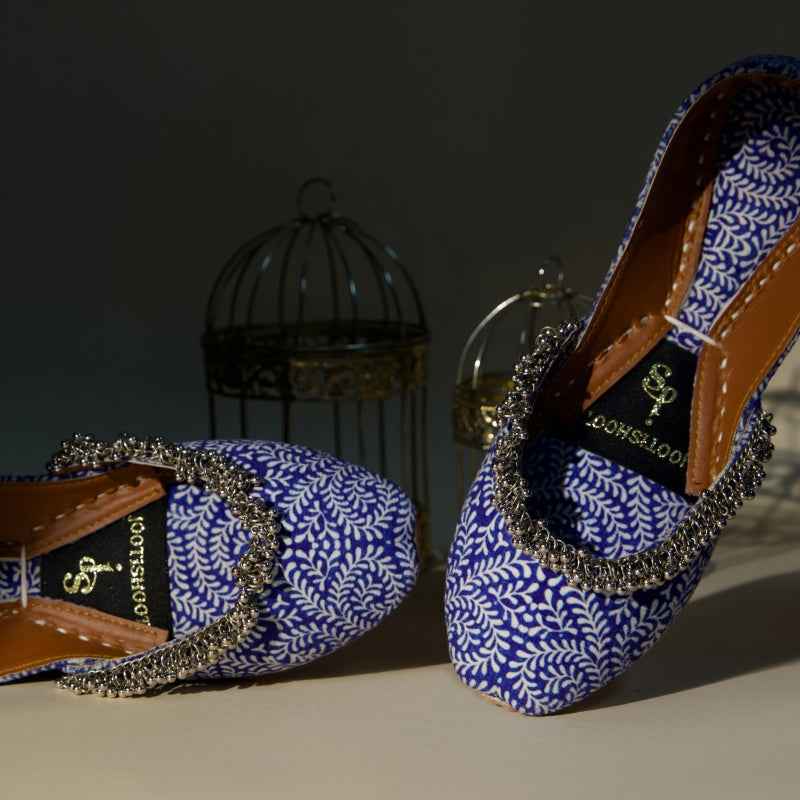 Our Indigo Vines khussa features intricate white vine motifs digitally printed on velvet, drawing inspiration from traditional block-printing techniques and is framed by a delicate metallic-bead fringe that catches the light with every step. As each pair is assembled entirely by hand, slight variations in print intensity and bead placement make yours truly one-of-a-kind. Style them with crisp white linen trousers and layered anklets for a relaxed daytime look, or let the indigo hue pop against a monochrome kurta for evening flair. To keep them looking their best, gently spot-clean with a damp cloth and store in a cool, dry place away from direct sunlight.
