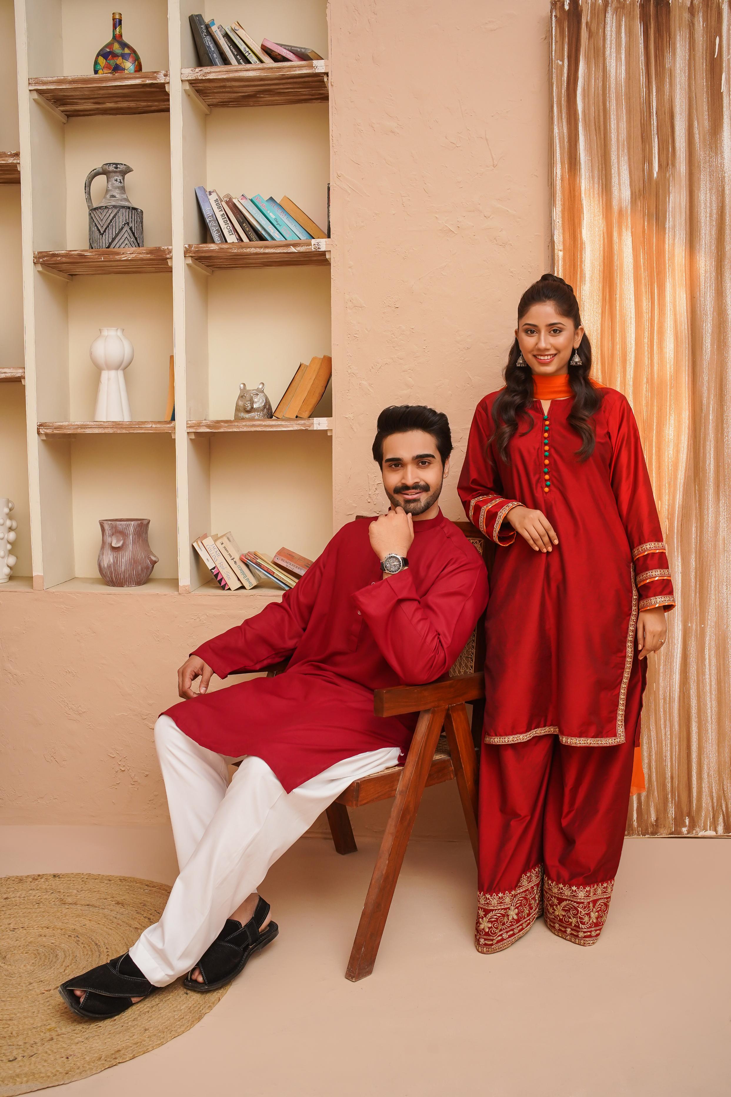 Step into timeless grace with this exquisite red cotton silk shirt, adorned with orange and green button detailing for a unique touch. The shirt features intricate block printing, enhanced by Zarri and sequins embroidery on the sleeves and daman, creating a mesmerizing fusion of tradition and elegance. Paired with a plain cotton silk trouser for a sophisticated balance, this ensemble is completed with a flowy red chiffon dupatta