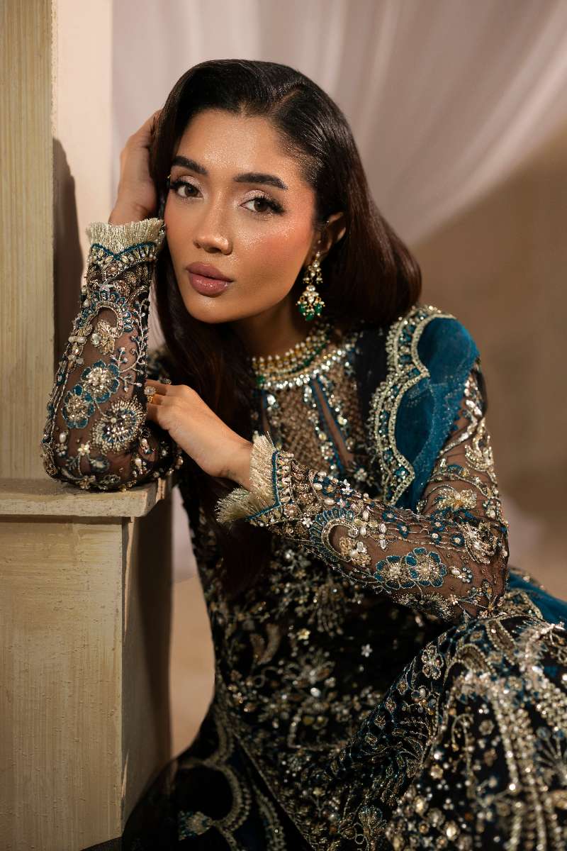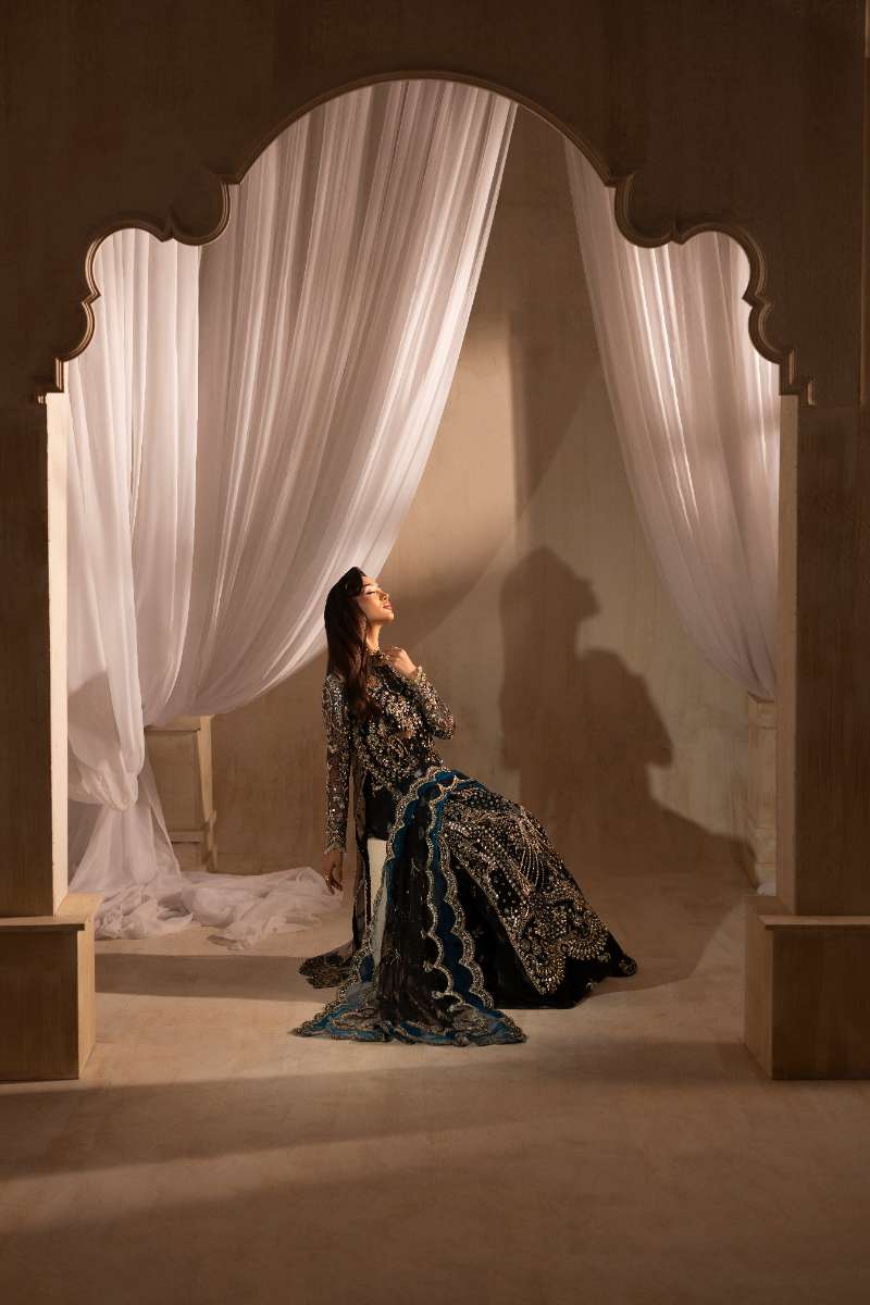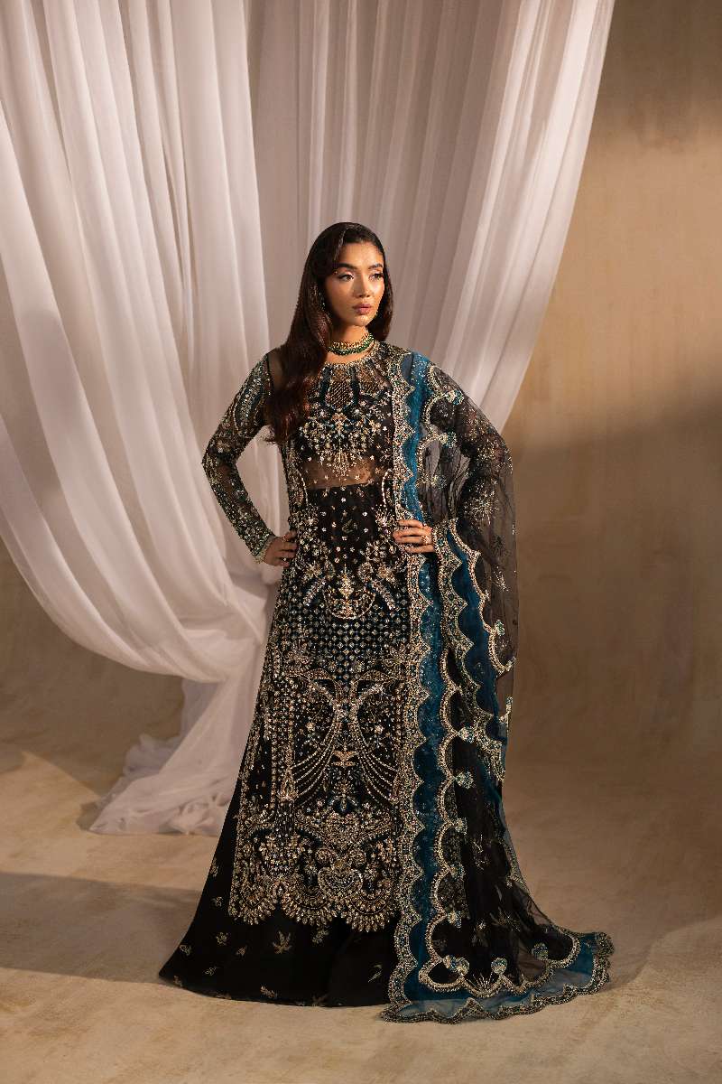 Siyah - Midnight Majesty. Command the room with Siyah, a look of enigmatic grandeur. This Straight Long Shirt, crafted from midnight-black Net, stands tall and statuesque. It is paired with contemporary silk Azaar pants featuring regal foil printing and net dupatta with organza finishing, adding a flash of metallic brilliance to the darkness. This is elegance with an edge, designed for the ruler of the night. Components: Straight Long Shirt, Azaar Pants, Dupatta Fabric: Net (Shirt+Dupatta) & Foil Printed Silk Fabric (Azaar Pants) Color: Jet Black Details: Foil Printing, Intricate Embroidery & Handwork