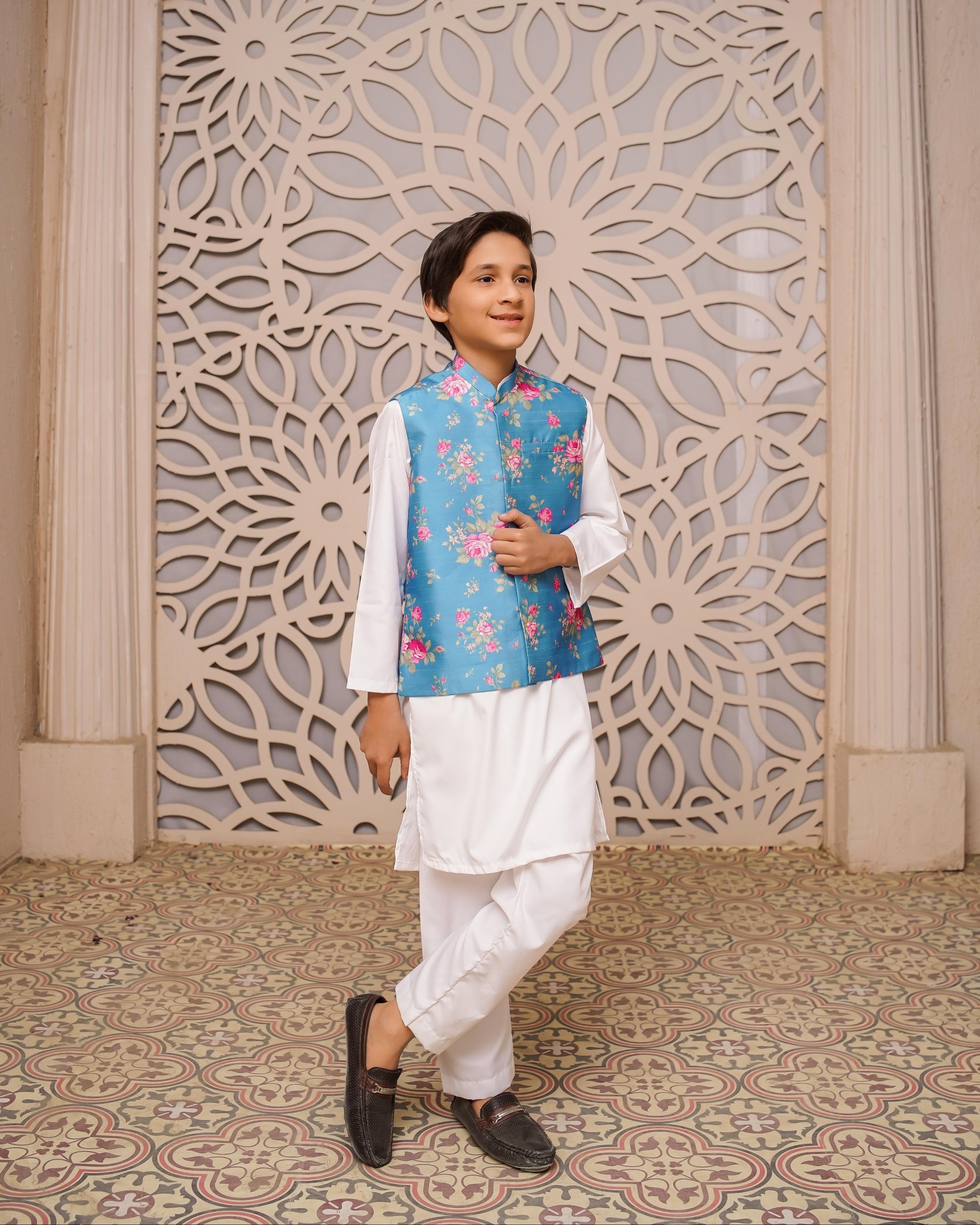 Dress your little gentleman in timeless elegance with this 3-piece ensemble. Featuring a printed raw silk blue waistcoat paired with a crisp white wash-and-wear kurta and pajama, this outfit is perfect for weddings, festive gatherings, and special occasions.