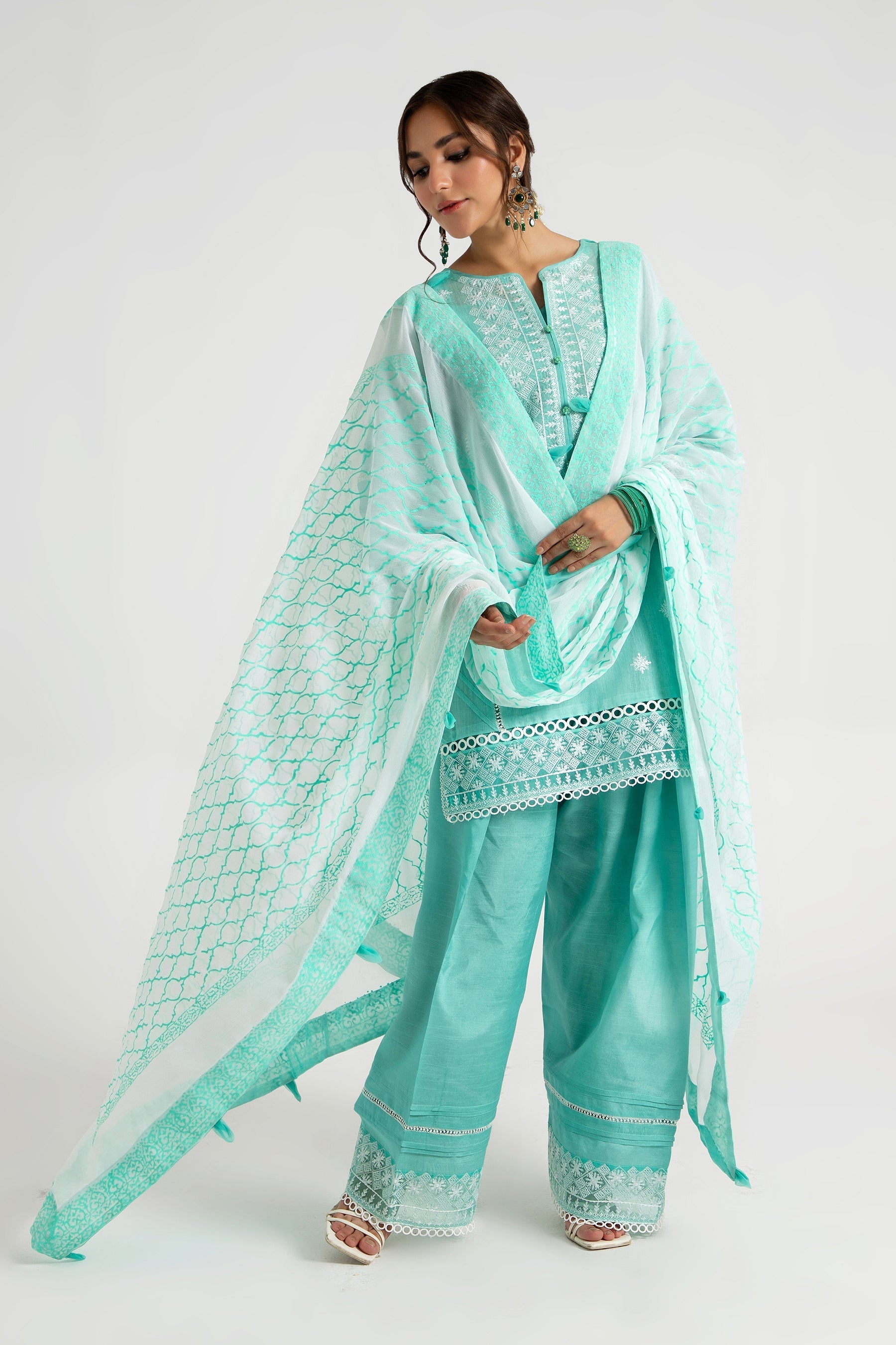 Aqua shirt with white embroidered framed neck line front panel, border and sleeves hem detailed with pleats and laces.