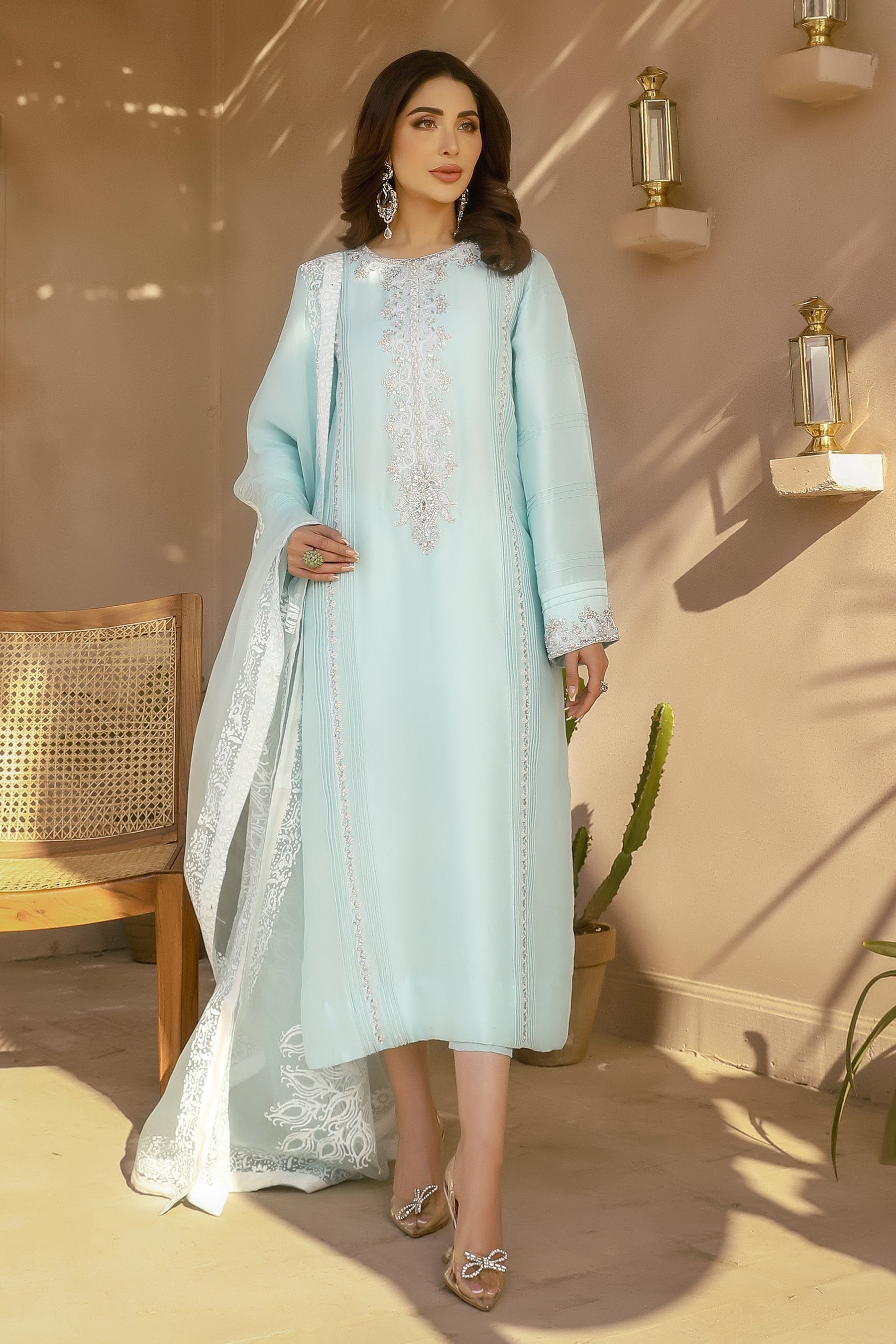 Arjan-An outstanding yet minimal outfit in aqua rawsilk with capri.this loose fit low slits shirts is embelished with white aari and silver embelisent on the neckline pannel sleeves and back motif with dori pleats along.it comes with block printed organza dupatta with silk facing.