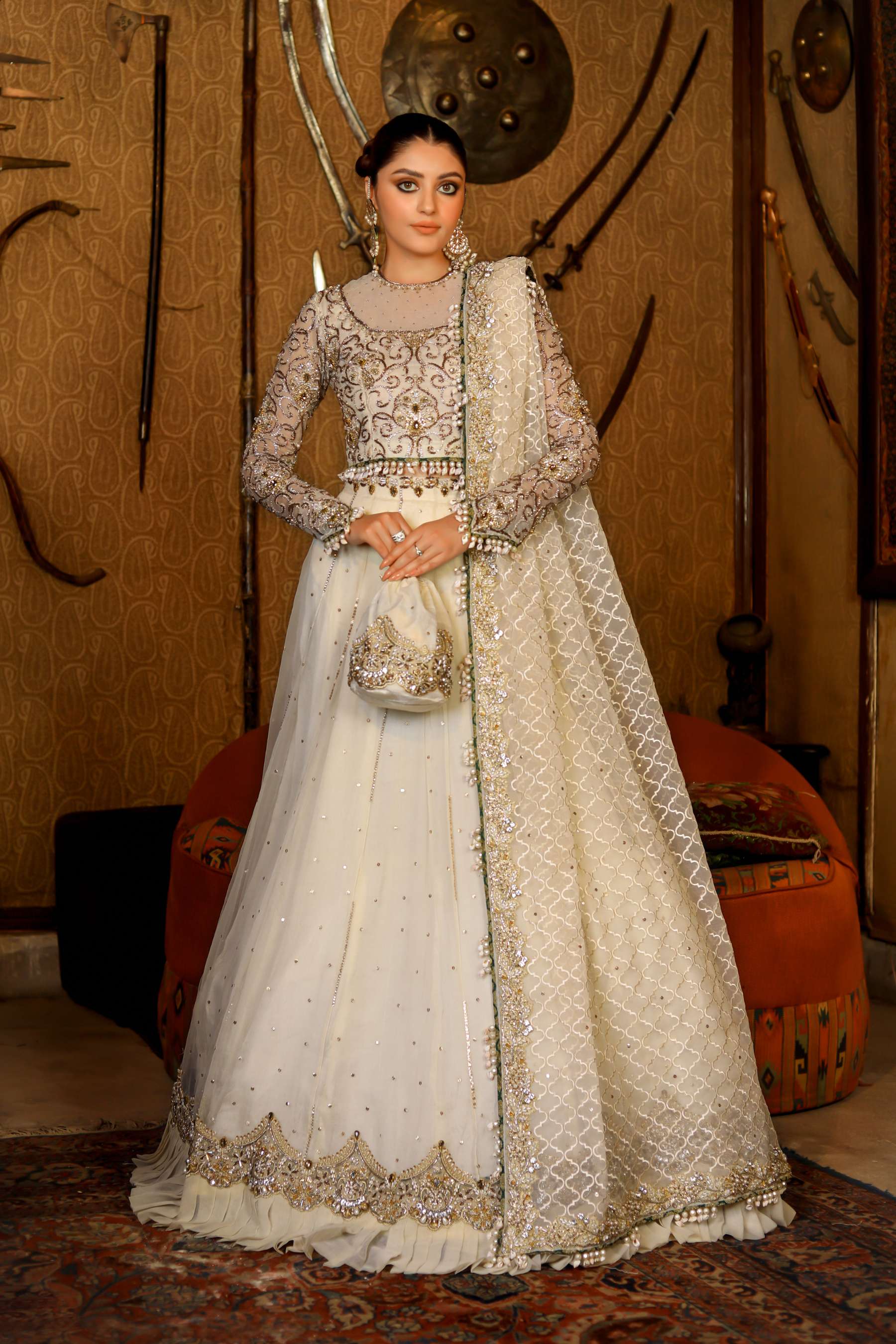 Its a 4 pcs bridal consisting of an organza blouse with sheer upper part and heavily hand embellished details. An organza lehanga with sequins lines and heavy border trim adorned with tilla,kora,dabka,sitara and kundan.it cones with heavy jaal dupatta with heavily embellished border around it trim with hangings.