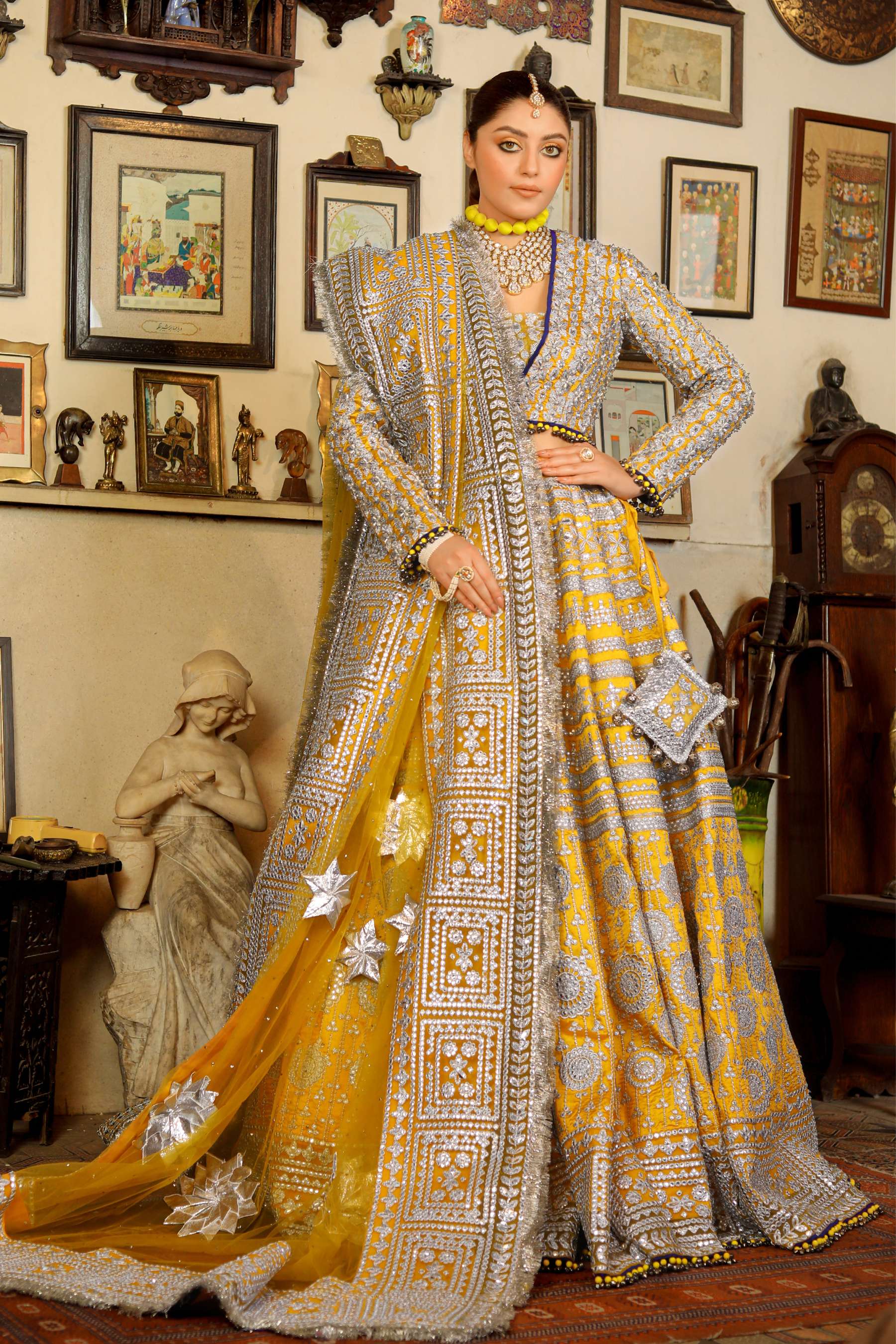 This true muse is an opulnet affaire in suraj mukhi a 4 piece yellow ensemble that is constructed in a timeless lehanga choli…the choli featues a generous jaal of pani wotk and hand embellished minimal embellishment and a lehanga featues a complete pani work pannels that is accenturated with tilla and panni in silver shadeit is worn with a beautiful net dupatta with hand made gotta flowers along with the border and kiran with blue facing. Yellow hangings with silver ghungru making this dress more fasinative.