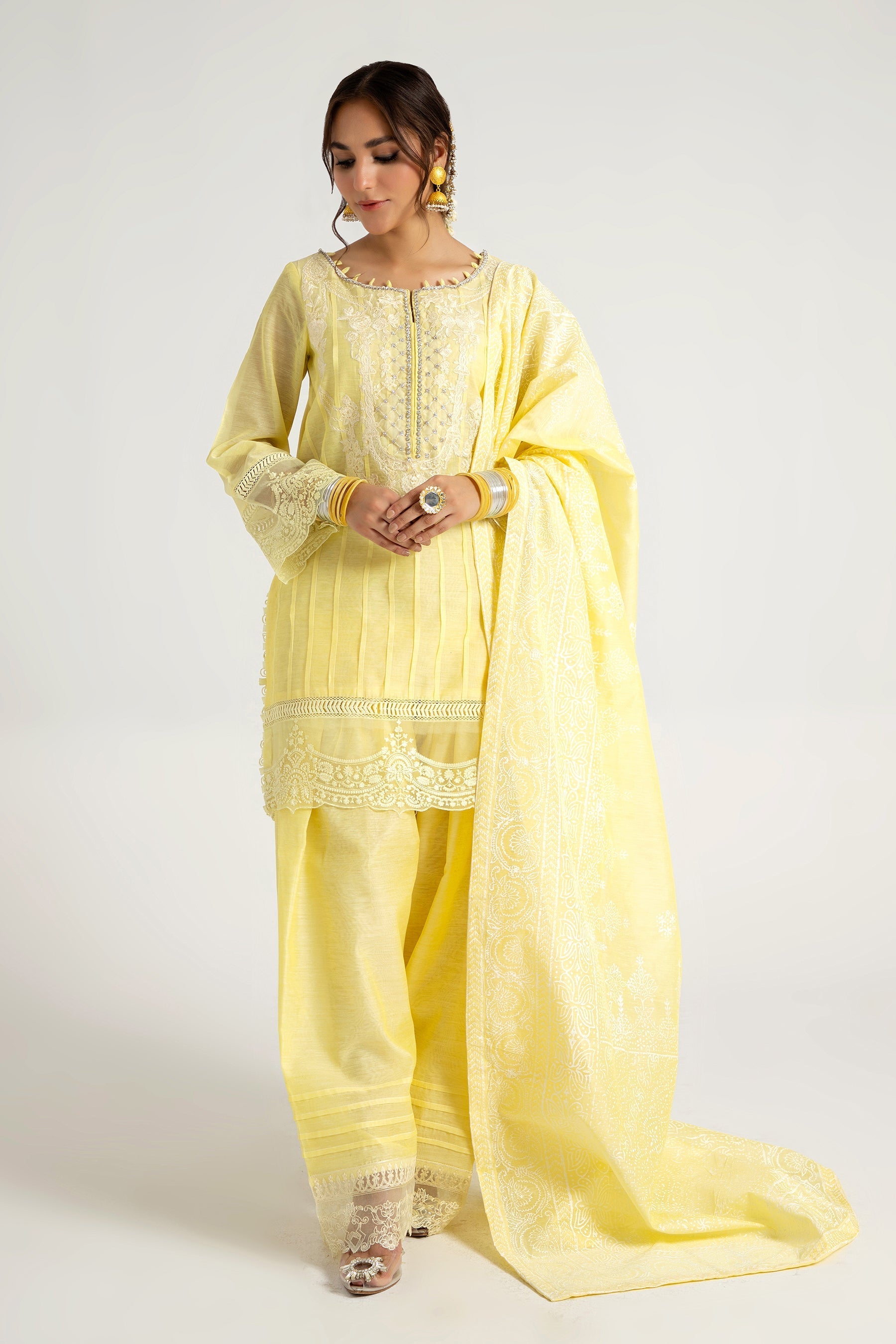 Yellow cotton silk pleated shirt with framed embroidered neckline adorned with flower bethki and border detailed with laces and fabric trims.