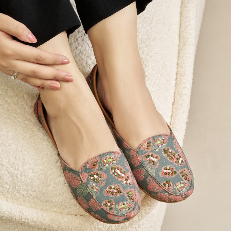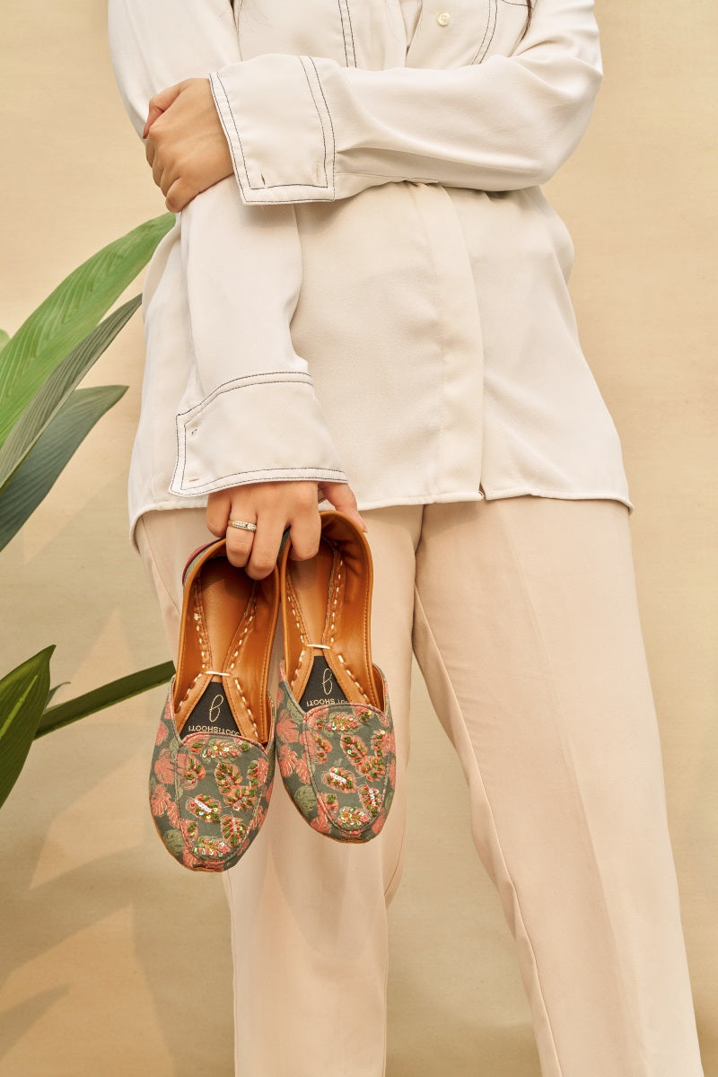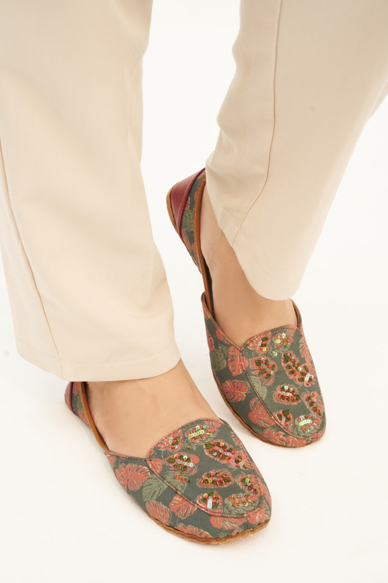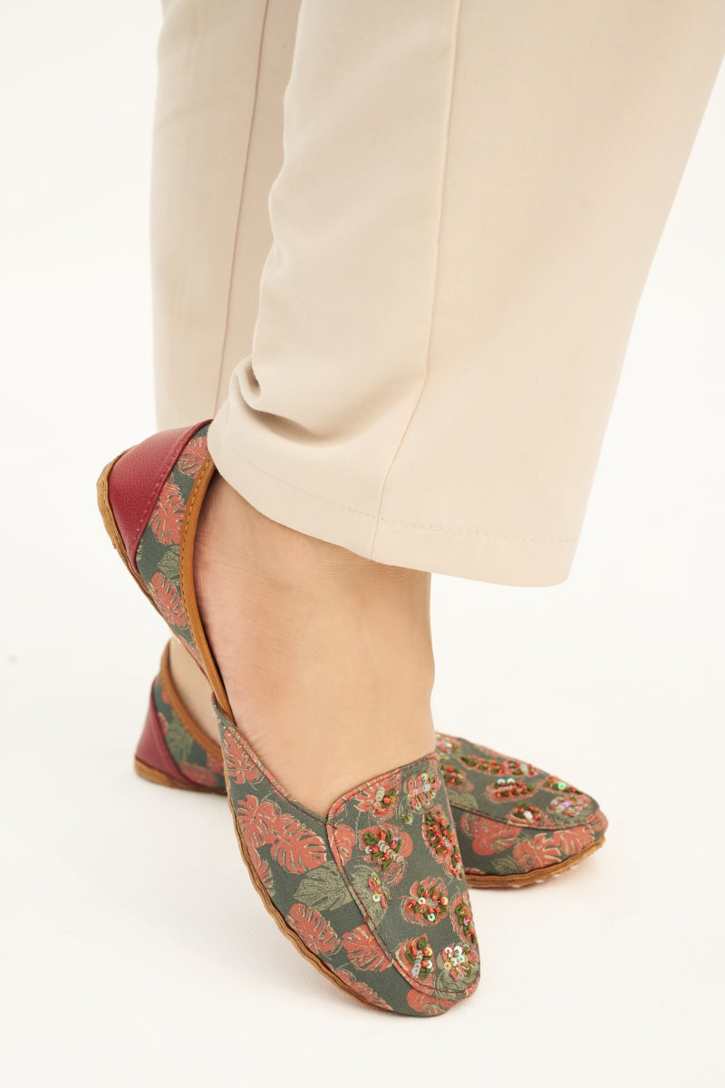 Step into elegance with our handcrafted embroidered Khussa flats. These exquisite shoes feature a delicate floral pattern in shades of green, red, and white, meticulously stitched onto a soft, muted green fabric. The intricate embroidery adds a touch of traditional charm, making these flats perfect for both casual and formal occasions. Designed for comfort and style, they are ideal for anyone looking to add a unique and artistic flair to their wardrobe. The cushioned insole ensures all-day comfort, while the durable sole provides excellent support. Elevate your footwear collection with these beautiful embroidered flats, a true testament to artisanal craftsmanship.