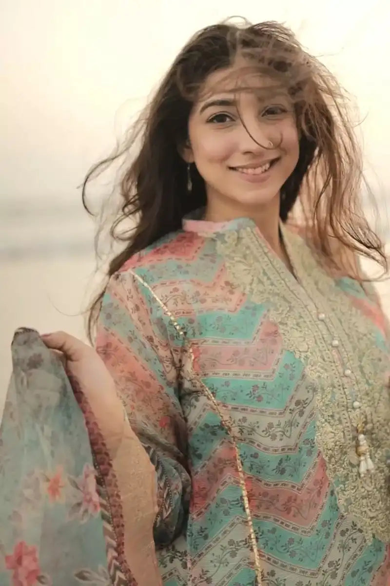 Aquamarine luxury article features a printed organza shirt with gold embroidery and fancy button details. These are finished with a flared trouser.
