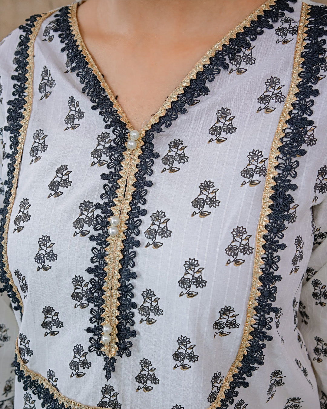 Step into timeless elegance with our ASSP-107 Dobby Spring 2PCS – a beautifully crafted outfit that blends tradition with sophistication. This screen-printed dobby lawn suit features intricate monochrome floral motifs on a soft white base, enhanced with elegant border detailing and lace accents. Perfect for casual gatherings, summer wear, or everyday elegance.