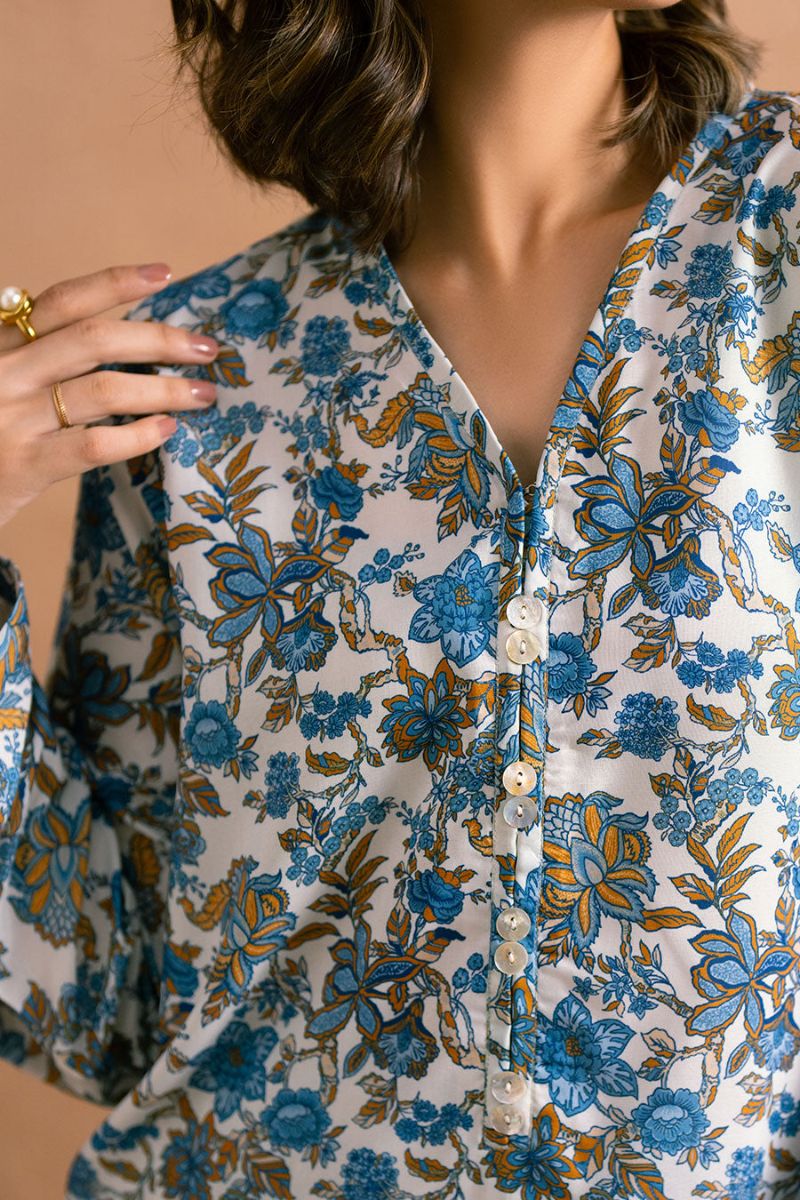 Introducing a garment that beautifully blends tradition and modernity, inspired by detailed blue, white, and mustard chinoiseries.