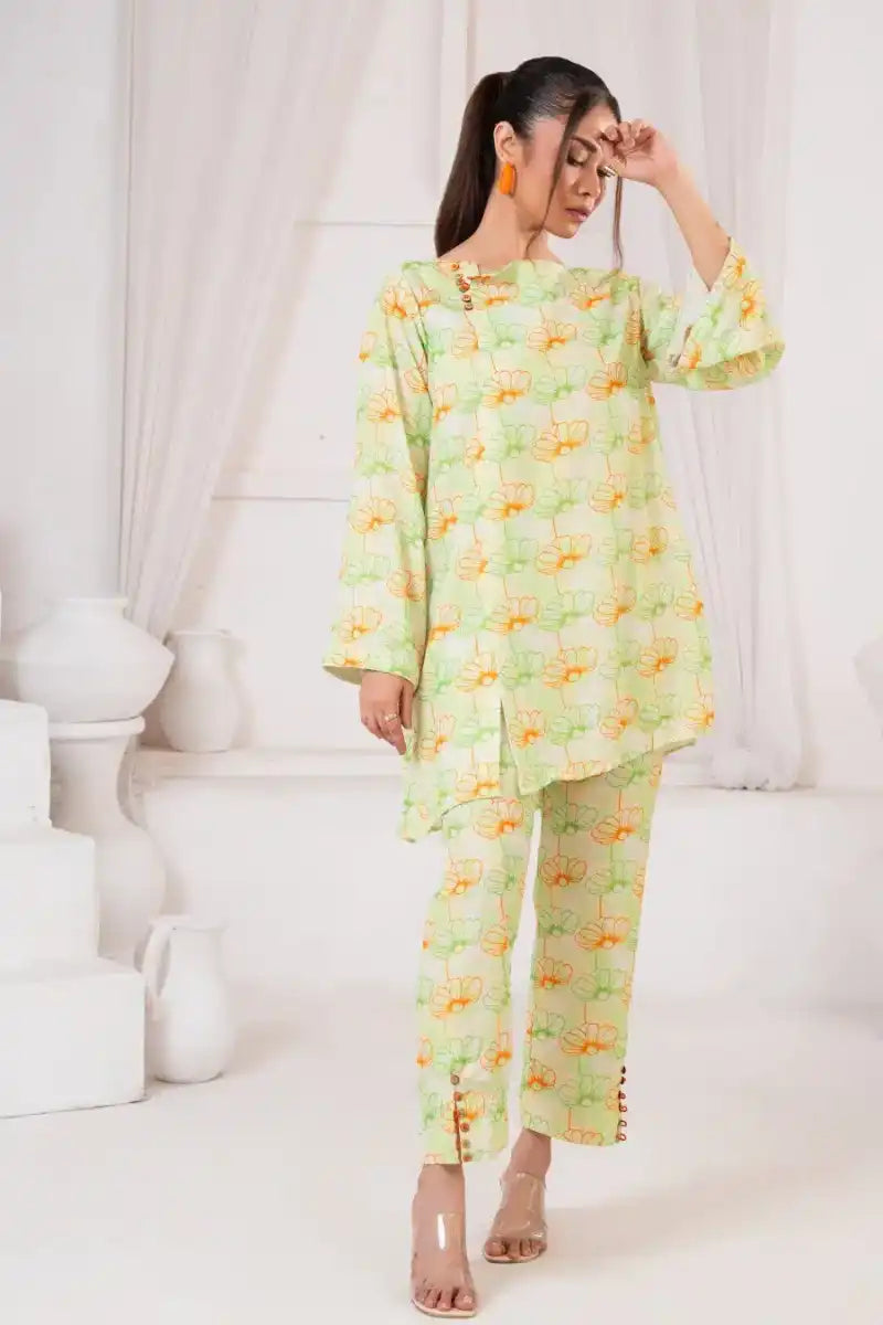Spring Orchid this alluring outfit is the perfect mix of elegance and charm. Its short-length shirt is decorated with a beautiful floral print in vibrant hues and enhanced with stylish buttons. Completing the graceful outfit with cigarette pants and colorful buttons, this outfit looks gorgeous overall look to style this season.