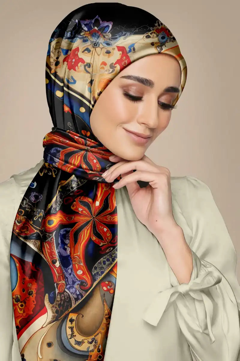 Elevate your style with the art painting elegant and traditional printed silk hijab. Silk hijabs exhibit a matte finish on one side and a glossy sheen on the other.