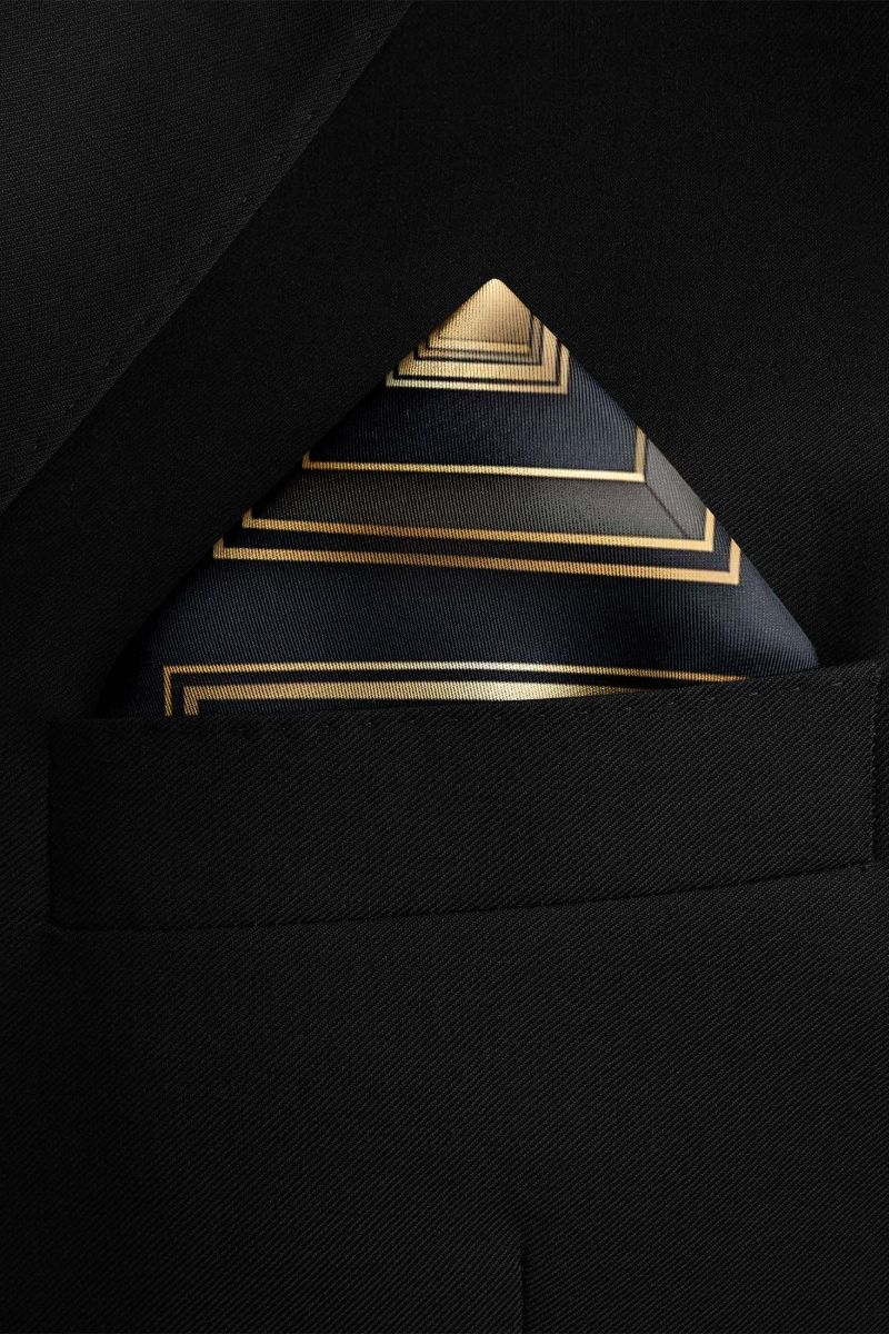 Elegant pocket square featuring a geometric design with repeating diamond shapes in gold, bronze, and black tones....