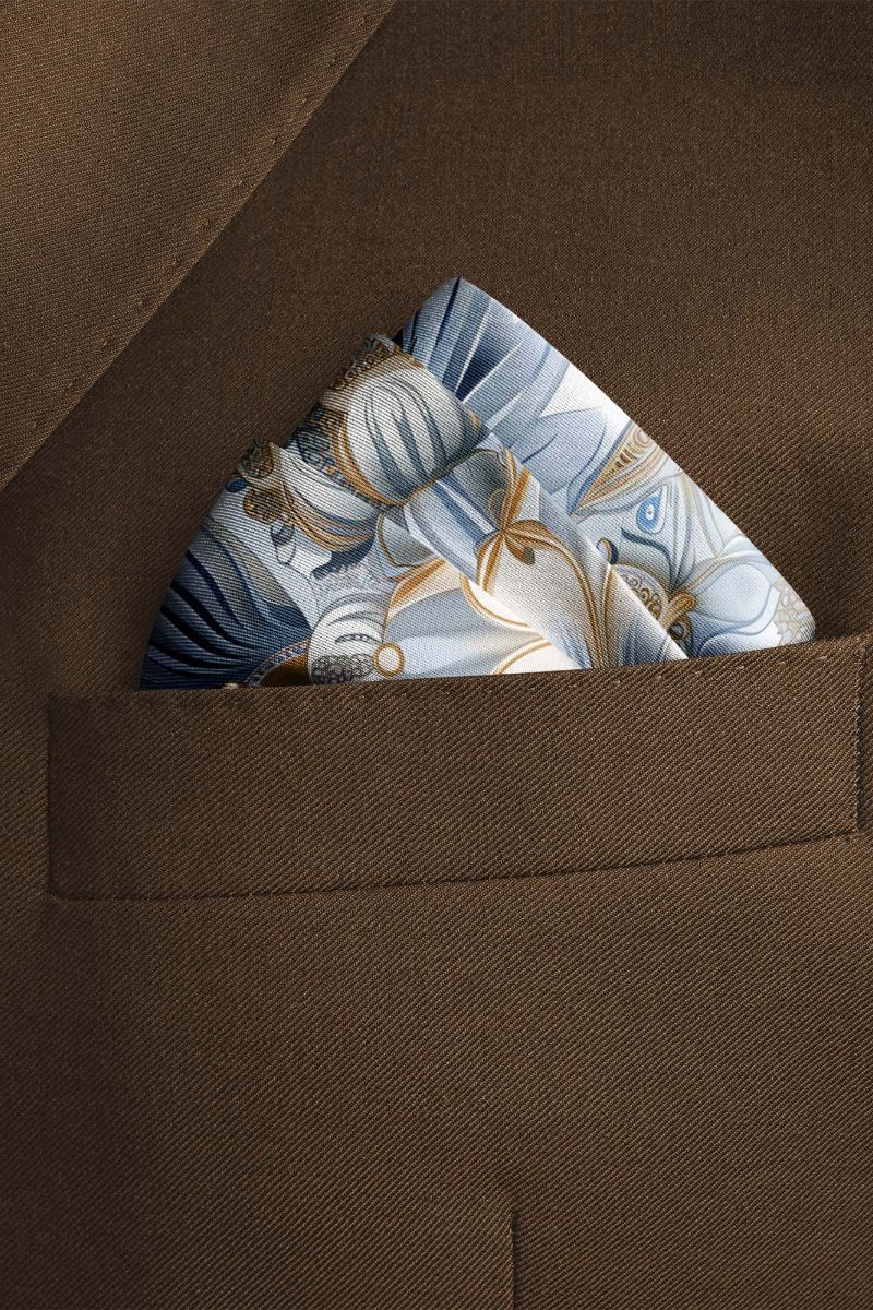 Elegant pocket square featuring symmetrical floral design with a central large flower in shades of white, gold, and light blue. Dark blue border and harmonious floral motifs radiate refinement and versatility.