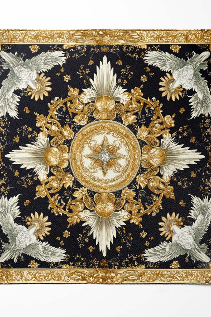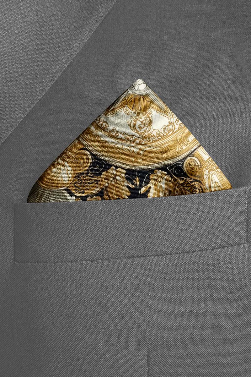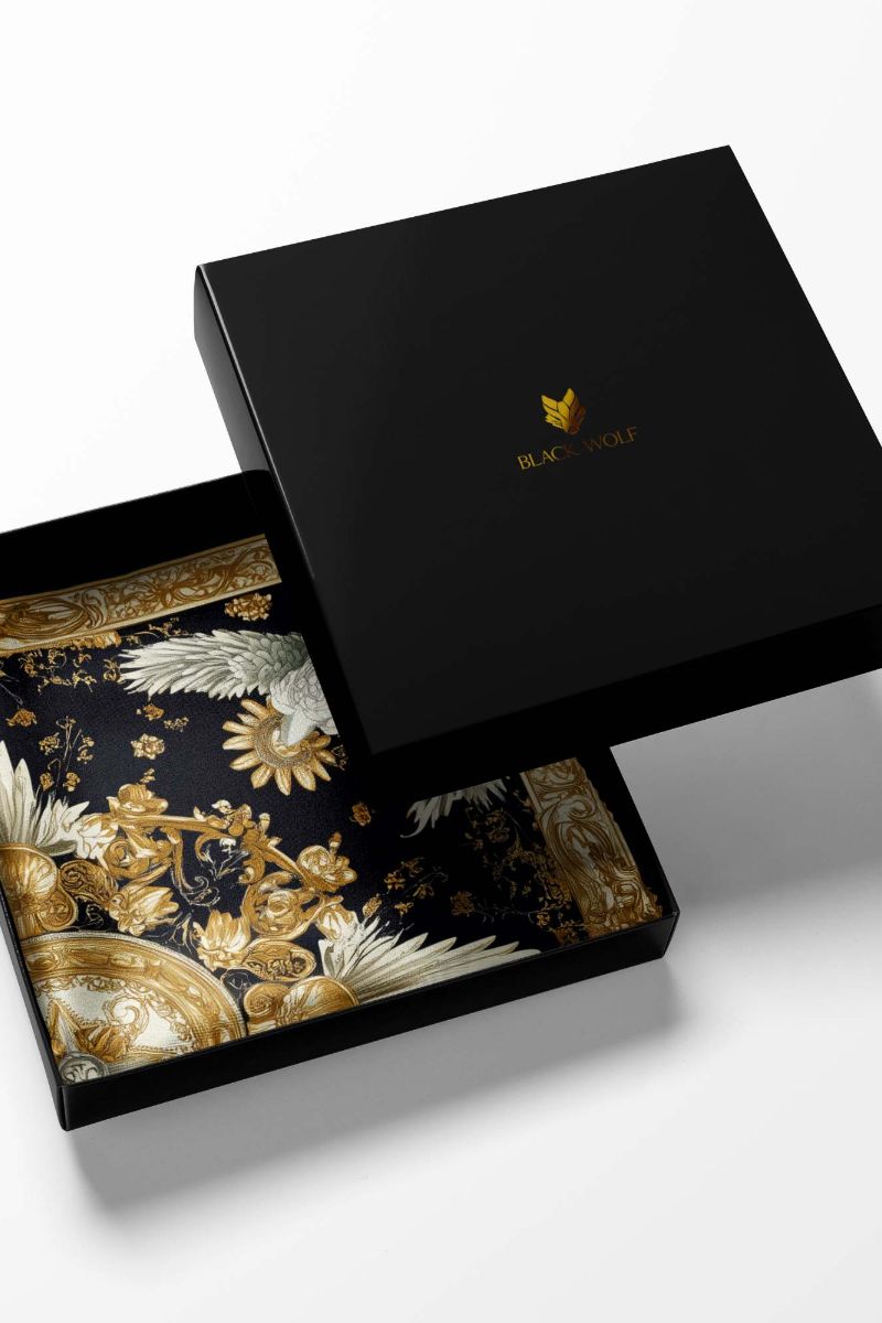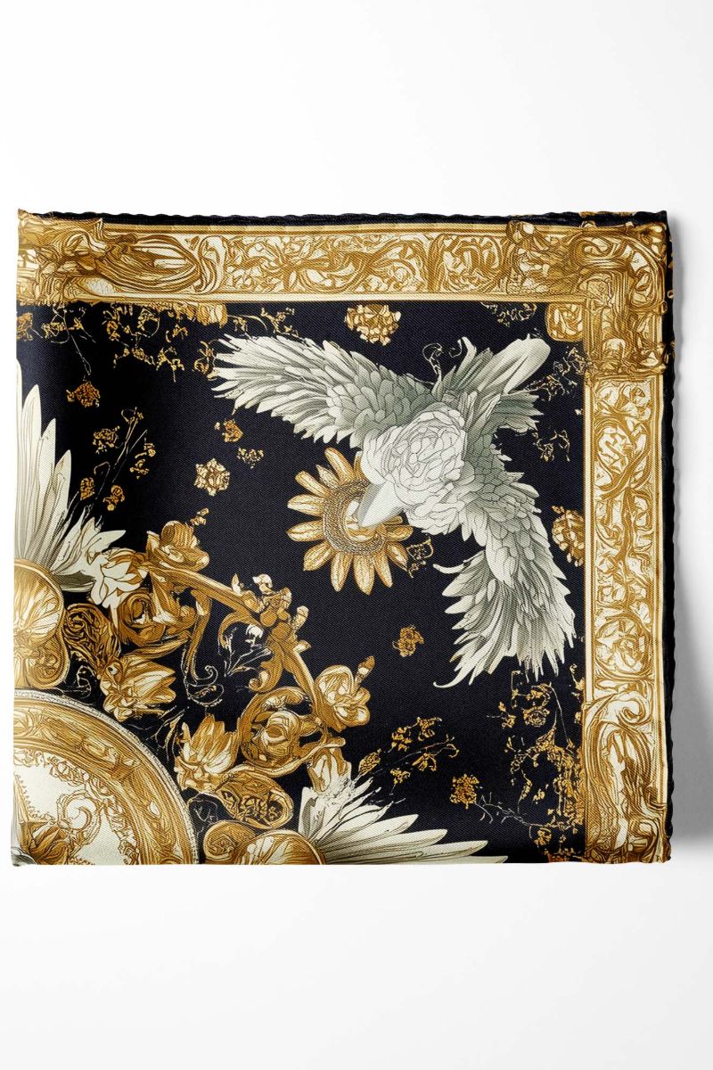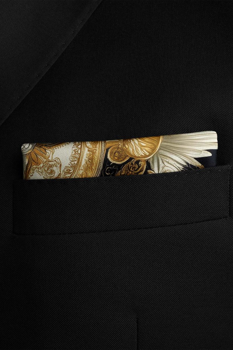 Sophisticated black pocket square featuring an ornate baroque-style design, radiates elegance and versatility, making it perfect for men’s suits and ideal as a coat pocket handkerchief.