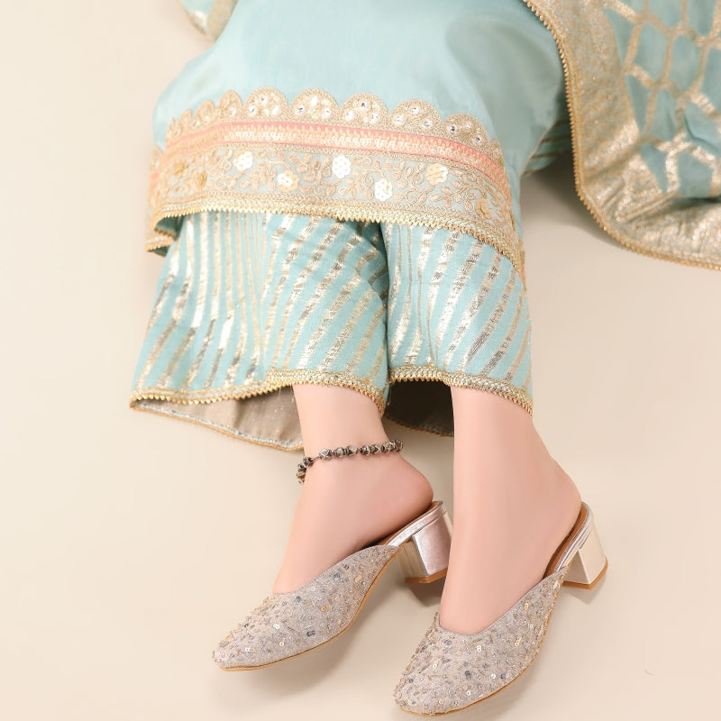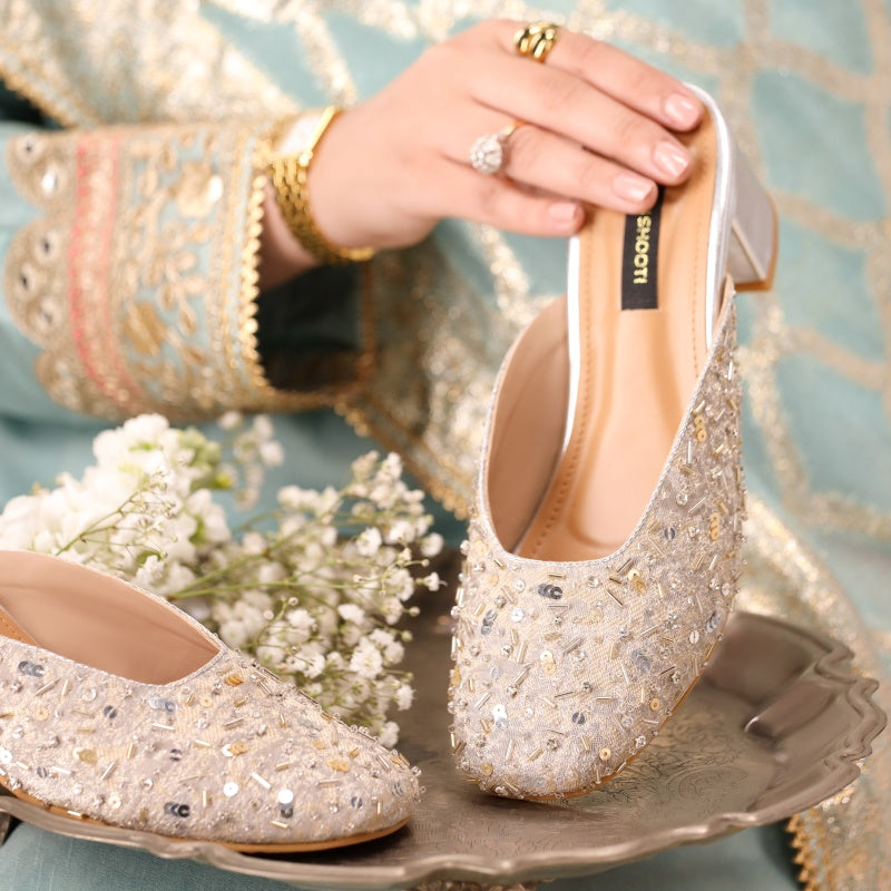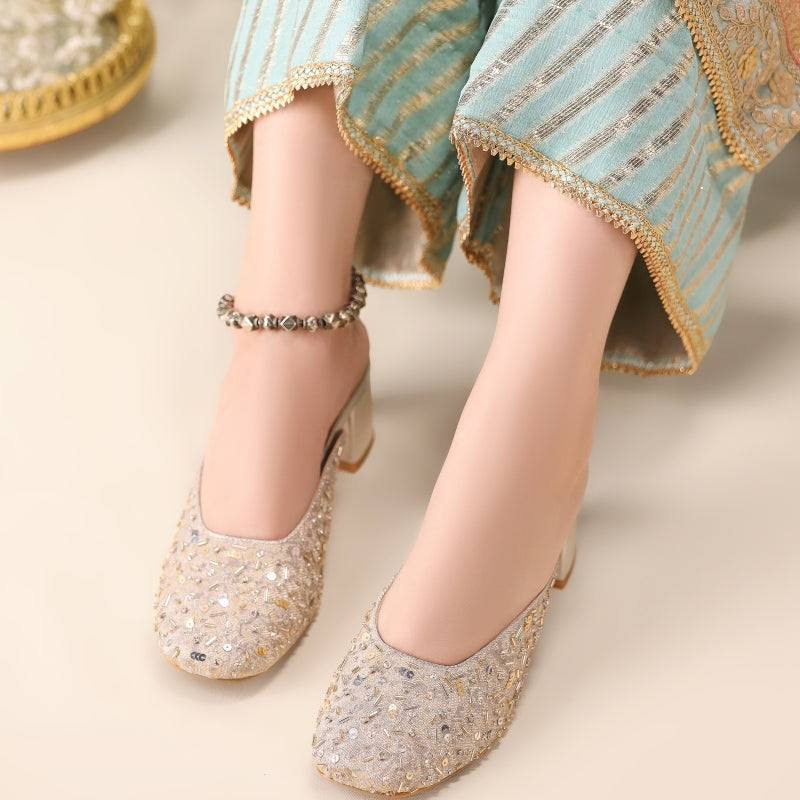 These stunning handcrafted heels feature a soft silver base adorned with an array of dazzling silver sequins, beads, and intricate embroidery. The luxurious embellishments create an elegant yet understated sparkle, perfect for traditional celebrations, weddings, or adding a touch of sophistication to your everyday look. Designed for both style and comfort, these heels are a timeless blend of cultural artistry and modern charm.