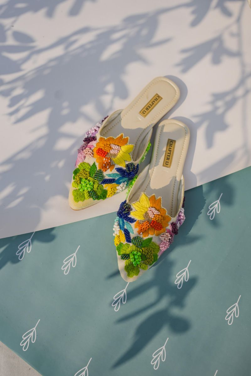 Elevate your style with our Mule | Bliss slides! Hand-embroidered with beads, matte thread, and cut pipes, these pointed-toe mules are a stylish favorite. The anti-skid sole ensures stability, making them perfect for any occasion. Step into the trend of mules and feel confident with every step. Upper: Cotton Canvas Bottom: Anti Skid Sheet Sole Please note: Due to the handmade nature of the collection and professional photography lights; colors, and/or patterns may vary slightly from the image shown. Minor differences enhance the beauty and uniqueness of each style