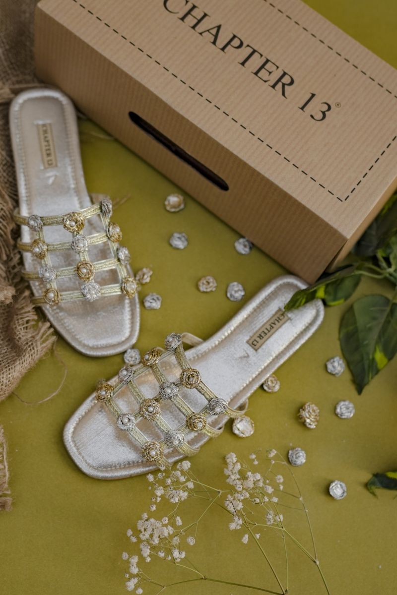 Add some sparkle to your step with our Goota Phool slides! Featuring hand-embroidered goota lace embellished with goota roses in golden and silver, pearls, these traditional formal slides are sure to turn heads. Plus, with a cushioned bottom and anti-skid sole, you'll feel as comfortable as you look glamorous. Slip these on and strut your stuff! Upper: Silk and Goota Bottom: Anti Skid Sheet Sole Please note: Due to the handmade nature of the collection and professional photography lights; colors, and/or patterns may vary slightly from the image shown. Minor differences enhance the beauty and uniqueness of each style
