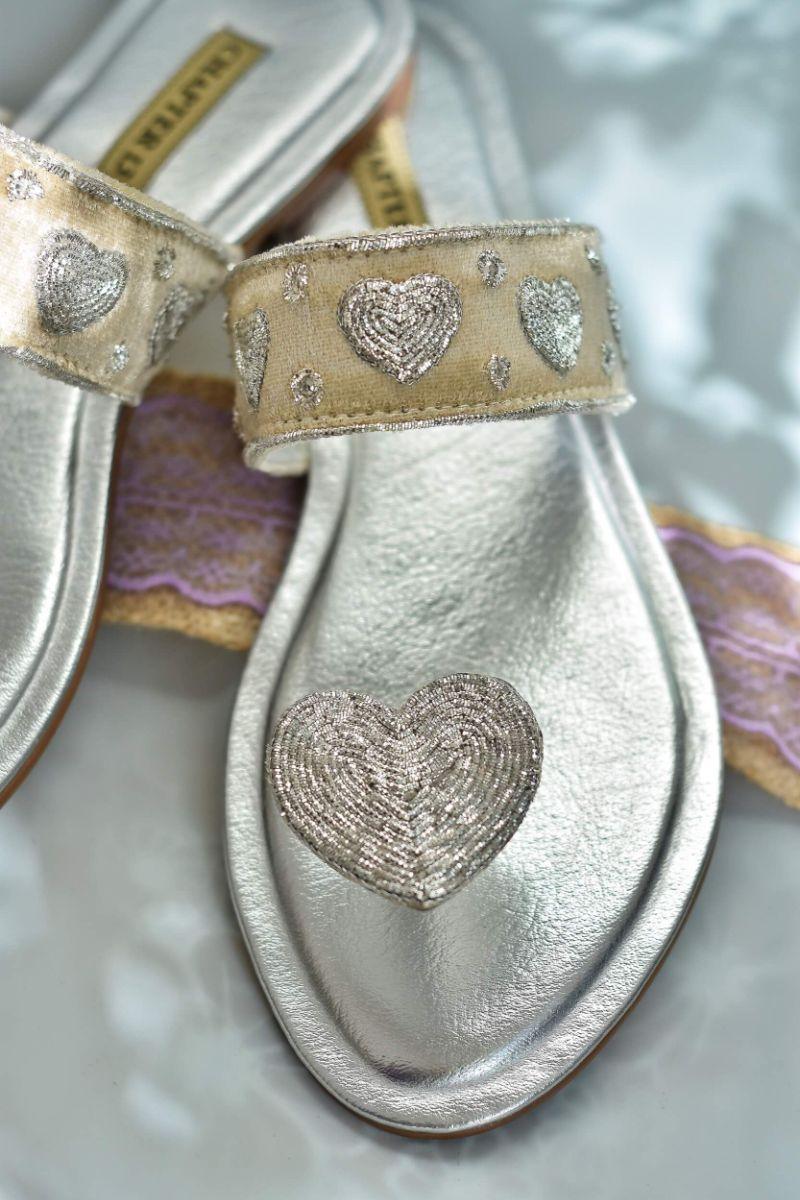 Get ready to fall in love with these Kohlapuri sandals! The Micro Velvet straps provide a luxurious feel, while the hand embroidered silver naqshi hearts and sequin mixed spray add a touch of elegance. The cut out heart on the thumb makes a statement, and the foam padded insole in luxurious rexine ensures a comfortable walk. Plus, the anti skid sole gives you confidence with every step. Don't miss out on these unique and stylish sandals! Upper: MicrovelvetBottom: Anti Skid Foam Cushioned Sole Please note: Due to the handmade nature of the collection and professional photography lights; colors, and/or patterns may vary slightly from the image shown. Minor differences enhance the beauty and uniqueness of each style