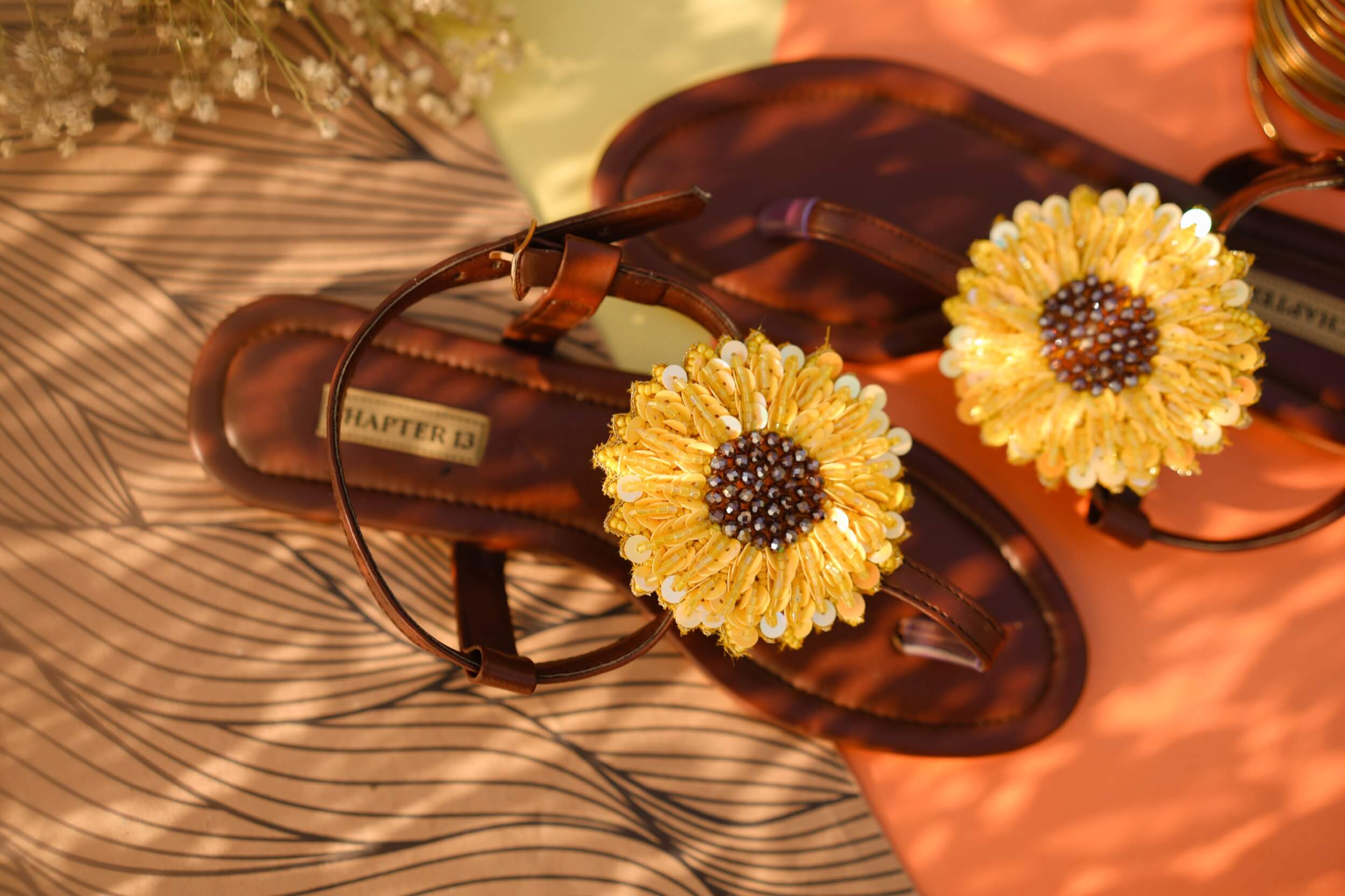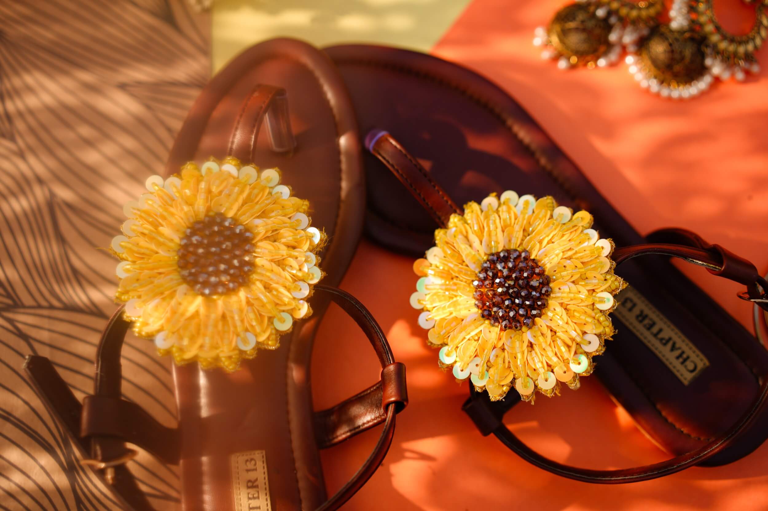 Step into sunshine with these whimsical Sunny Bloom sandals! Hand-embroidered with vibrant sequins, cut pipes, and beads in cheerful yellow, each pair features a stunning brown crystal centerpiece that brings the sunflower design to life. The cushioned dark brown sole keeps your feet comfortable all day long, while the adjustable elastic and buckle strap ensures a perfect fit. Whether you're heading to the beach or a garden party, these playful sandals are your ticket to turning heads and spreading joy with every step.