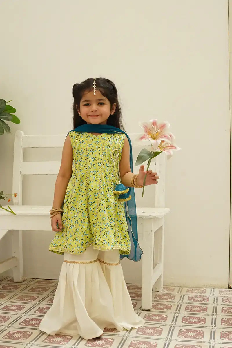 Apple green malai lawn Angrakha, paired with elegant white gharara and a contrast teal dupatta. Finished with playful tassels for a festive look.