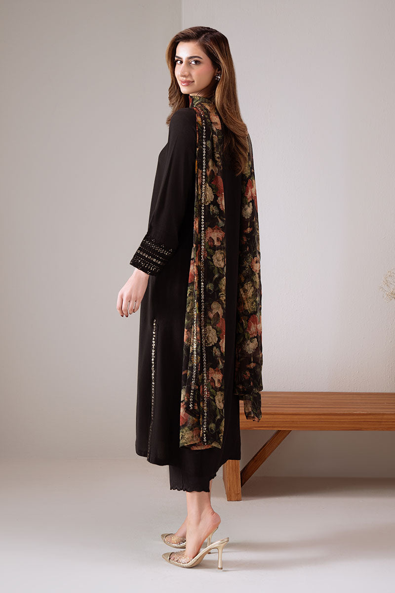 Elevate your wardrobe with this sophisticated two-piece ensemble featuring a premium silk shirt paired with an elegant chiffon dupatta. The shirt showcases a classic straight-front open design with front and back plain dyed fabric for timeless appeal. A refined half-band neckline with V-cut detailing and functional front buttons adds contemporary flair, while straight sleeves are adorned with intricate embroidered borders. The accompanying chiffon dupatta features printed embroidery, completing this versatile look perfect for both casual gatherings and formal occasions. Crafted with attention to detail, this set combines traditional craftsmanship with modern silhouettes.
