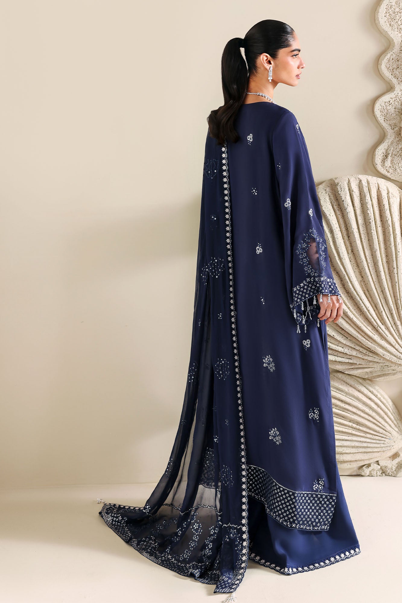 UNSTITCH 3PC: SILK EMBROIDERED FRONT,BACK AND SLEEVES,80 EMBROIDERED PATTI FOR FRONT AND BACK HEM, SILK DYED TROUSER 60 EMBROIDERED PATTI FOR TROUSER AND CHIFFON EMBROIDERED DUPATTA2 EMBROIDERED PALLU FOR DUPATTA
