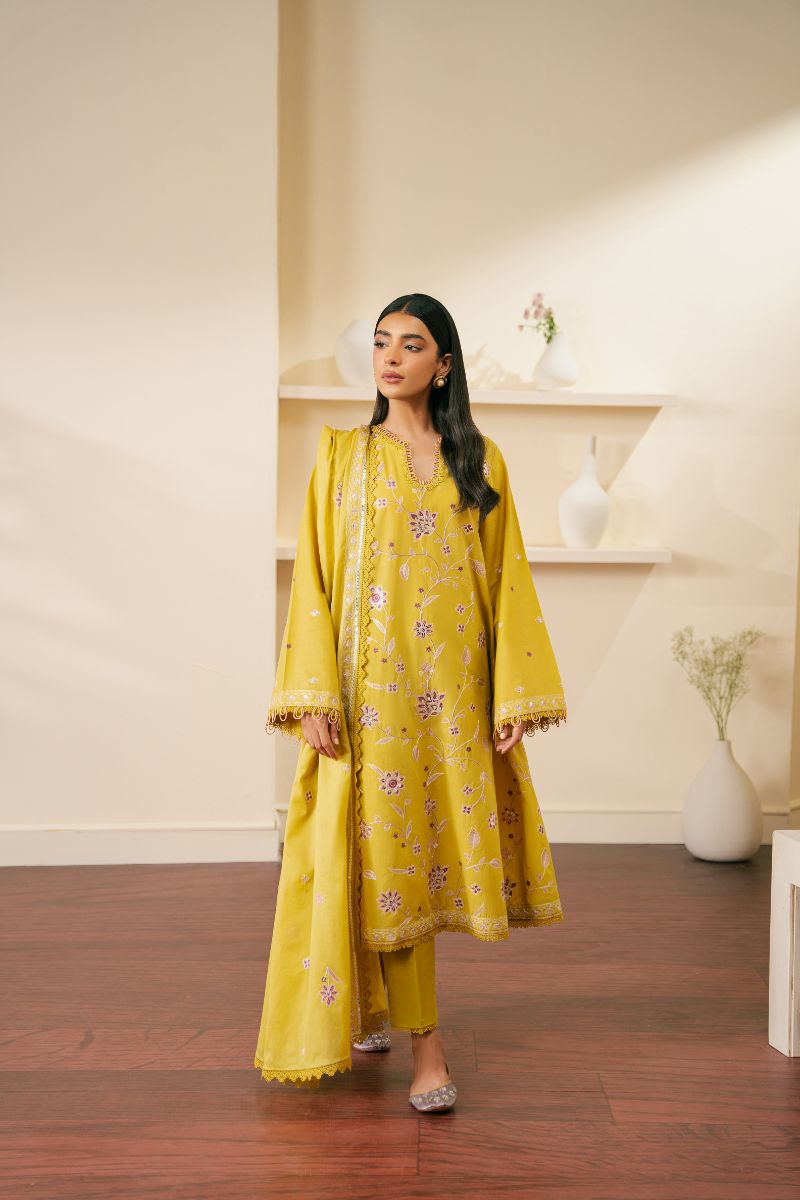 UNSTITCH 3PC: CAMBRIC EMBROIDERED SHIRT FRONT, BACK AND SLEEVES, CAMBRIC DYED TROUSER AND LAWN EMBROIDERED DUPATTA