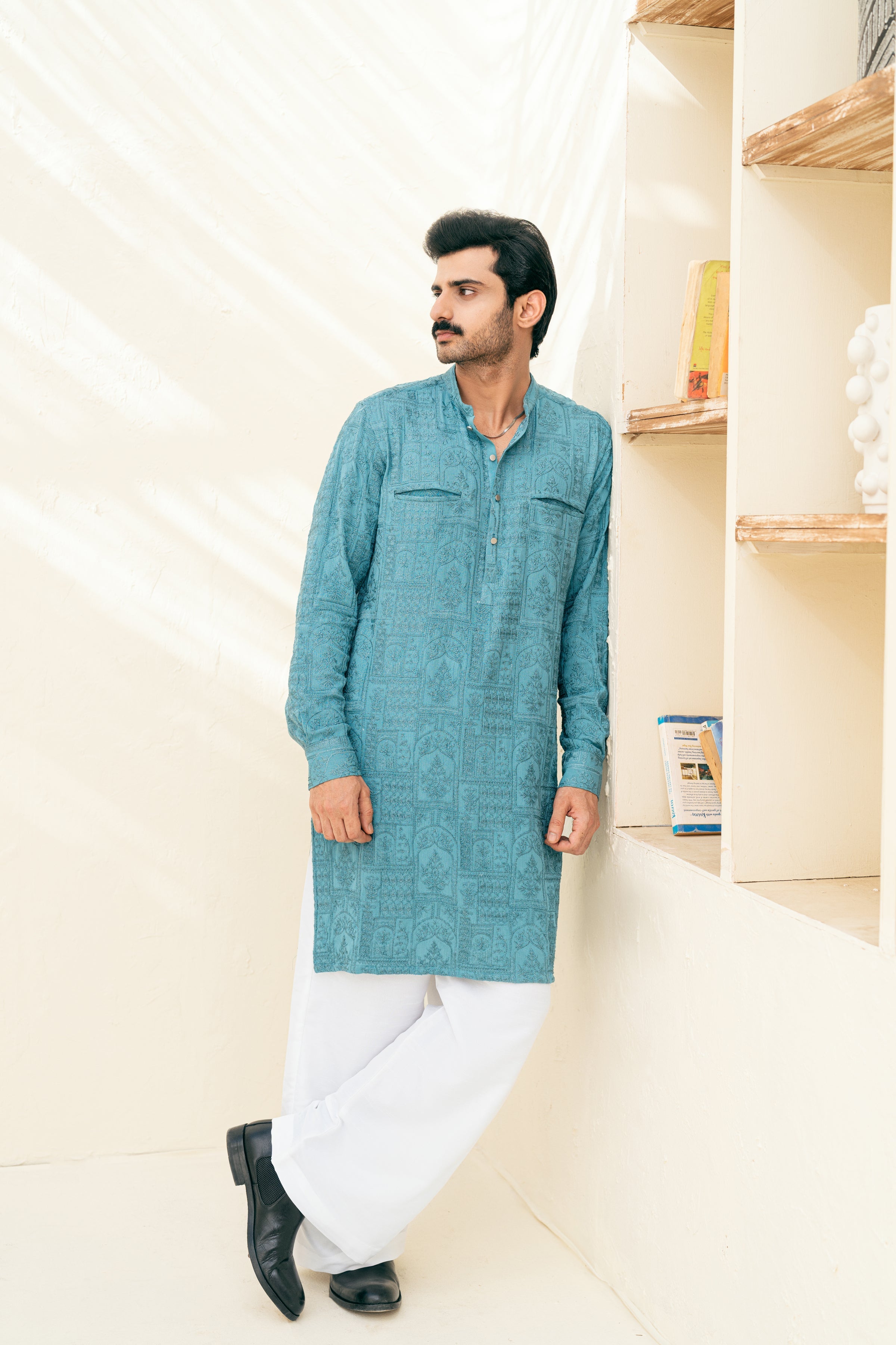 Tailored from premium gauze cotton fabric, this kurta exudes sophistication with its sherwani collar, cuff sleeves, and bone pockets for a structured yet refined look. The monotone Resham embroidery in a modern pattern adds subtle elegance, while metal buttons enhance its contemporary appeal. Paired with cotton Farsi trousers, this ensemble offers a perfect blend of tradition and modernity, making it ideal for Eid or festive occasions.